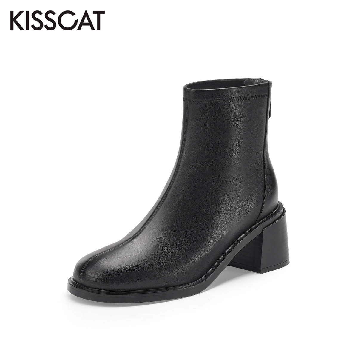 KISS CAT/接吻猫秋冬新款羊皮圆头后拉链粗高跟短靴女KA32779-51