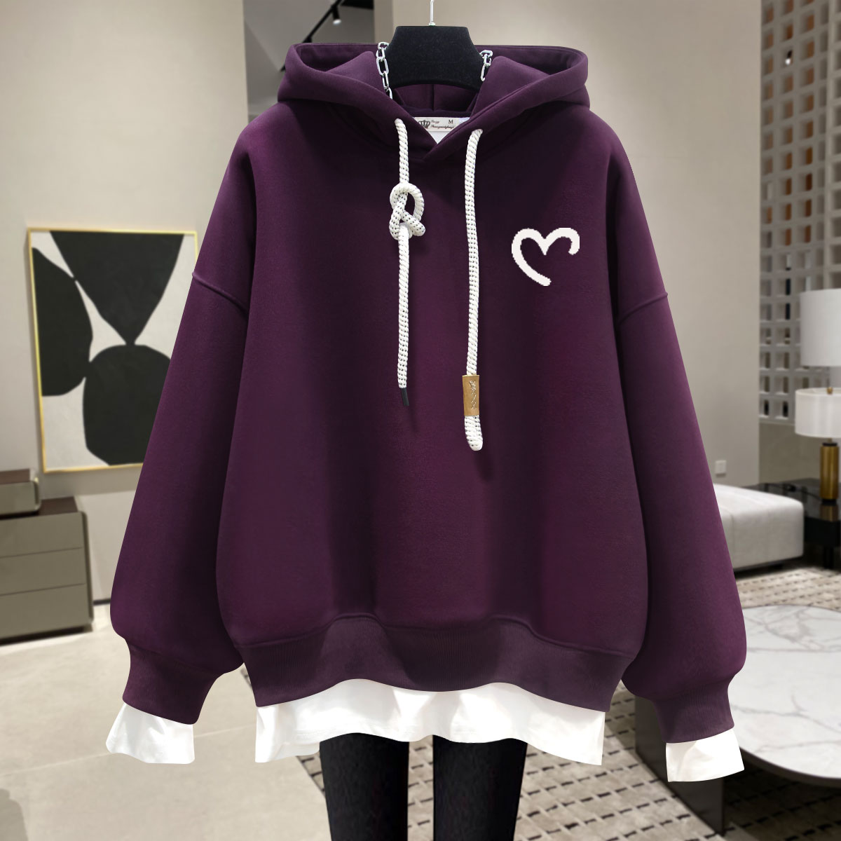 2025春秋冬季新款半小爱心中长款加绒加厚宽松套头长袖连帽卫衣女