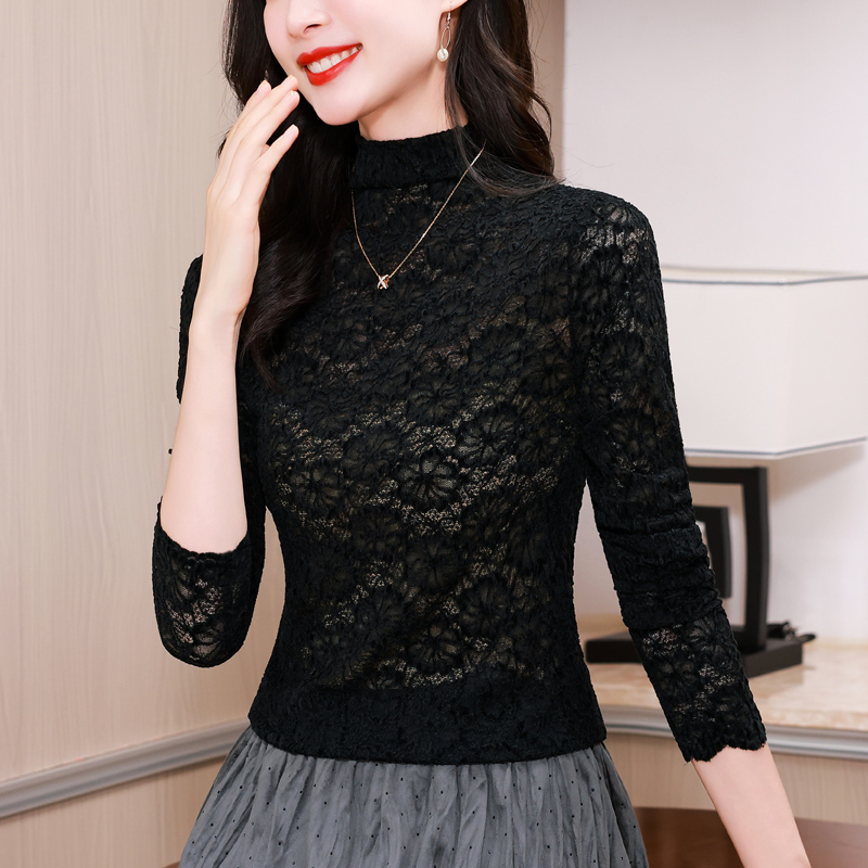 时尚半高领蕾丝打底衫女内搭秋冬新款减龄洋气长袖T恤高级感上衣