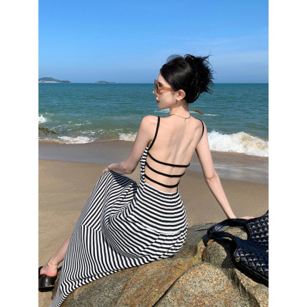 带胸垫吊带紧身连衣裙夏季新款裙子露背修身洋气度假条纹长裙子潮