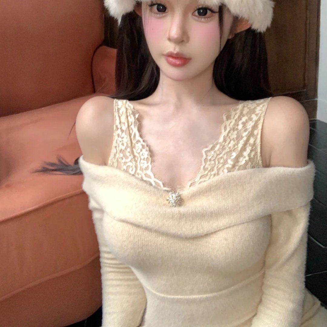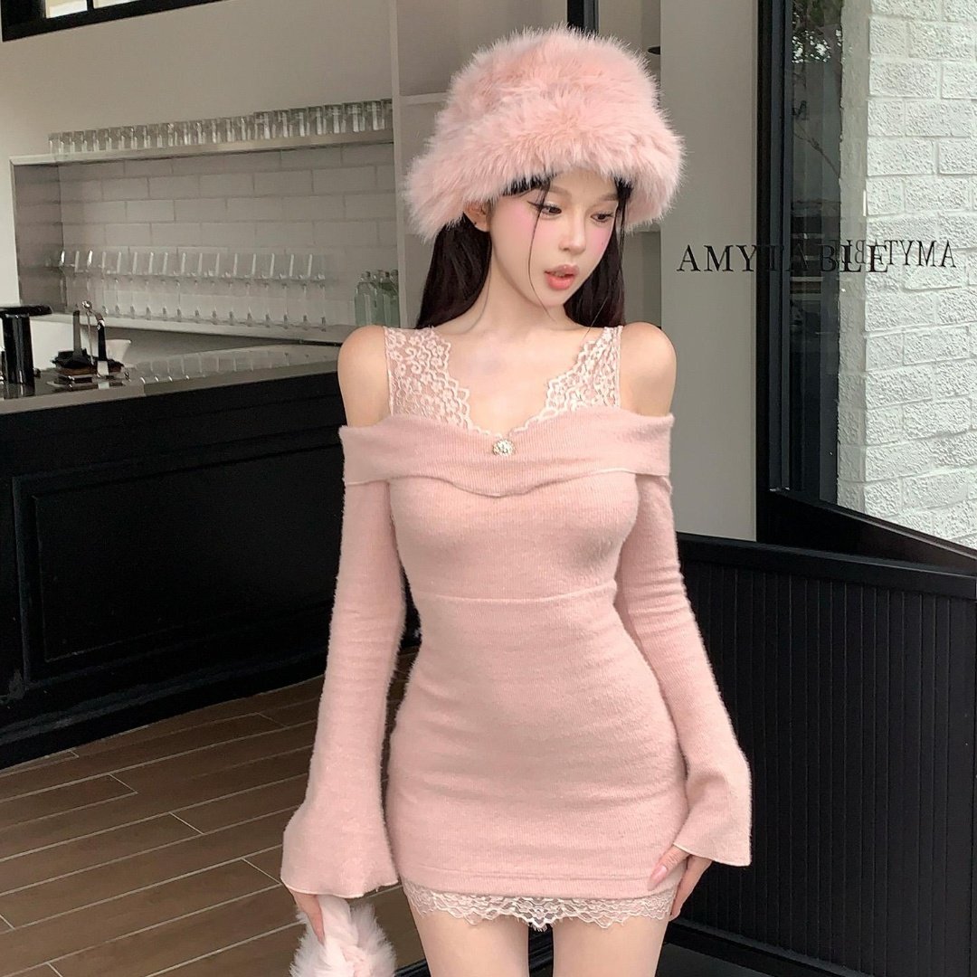 法式高级感一字肩拼接蕾丝针织连衣裙女秋冬季新款修身显瘦包臀裙