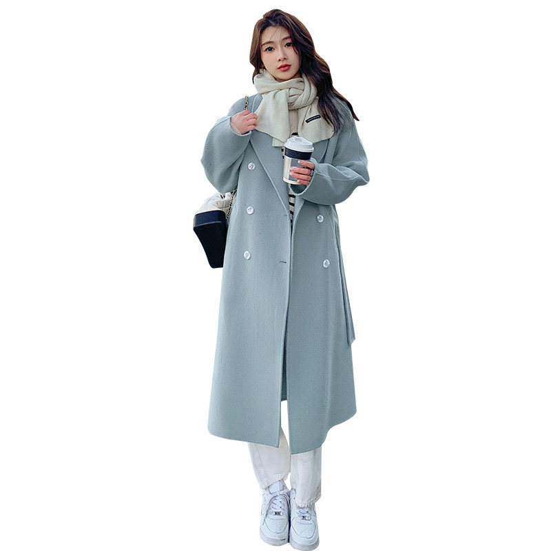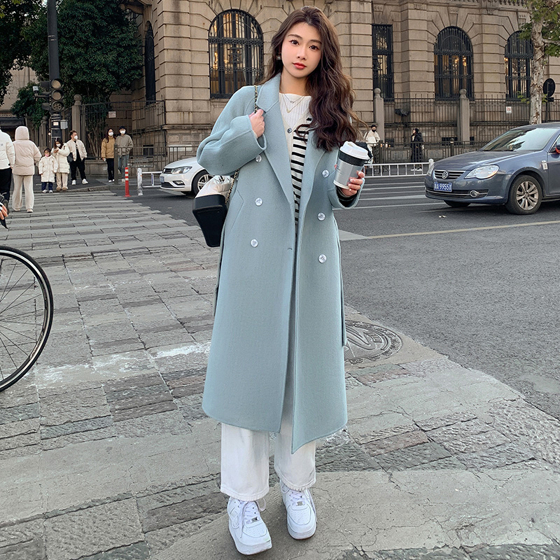 蓝色双面绒毛呢大衣2024年秋冬新款韩版宽松中长款系带毛呢外套女
