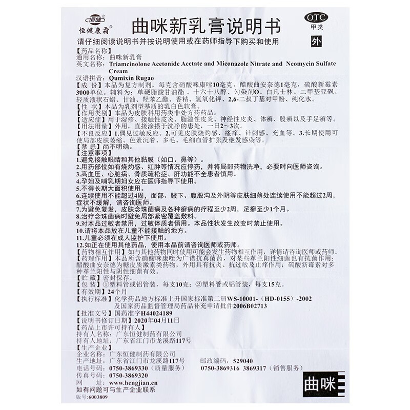 恒健 曲咪新乳膏 10g湿疹接触性皮炎脂溢性皮炎癣股癣手足癣等