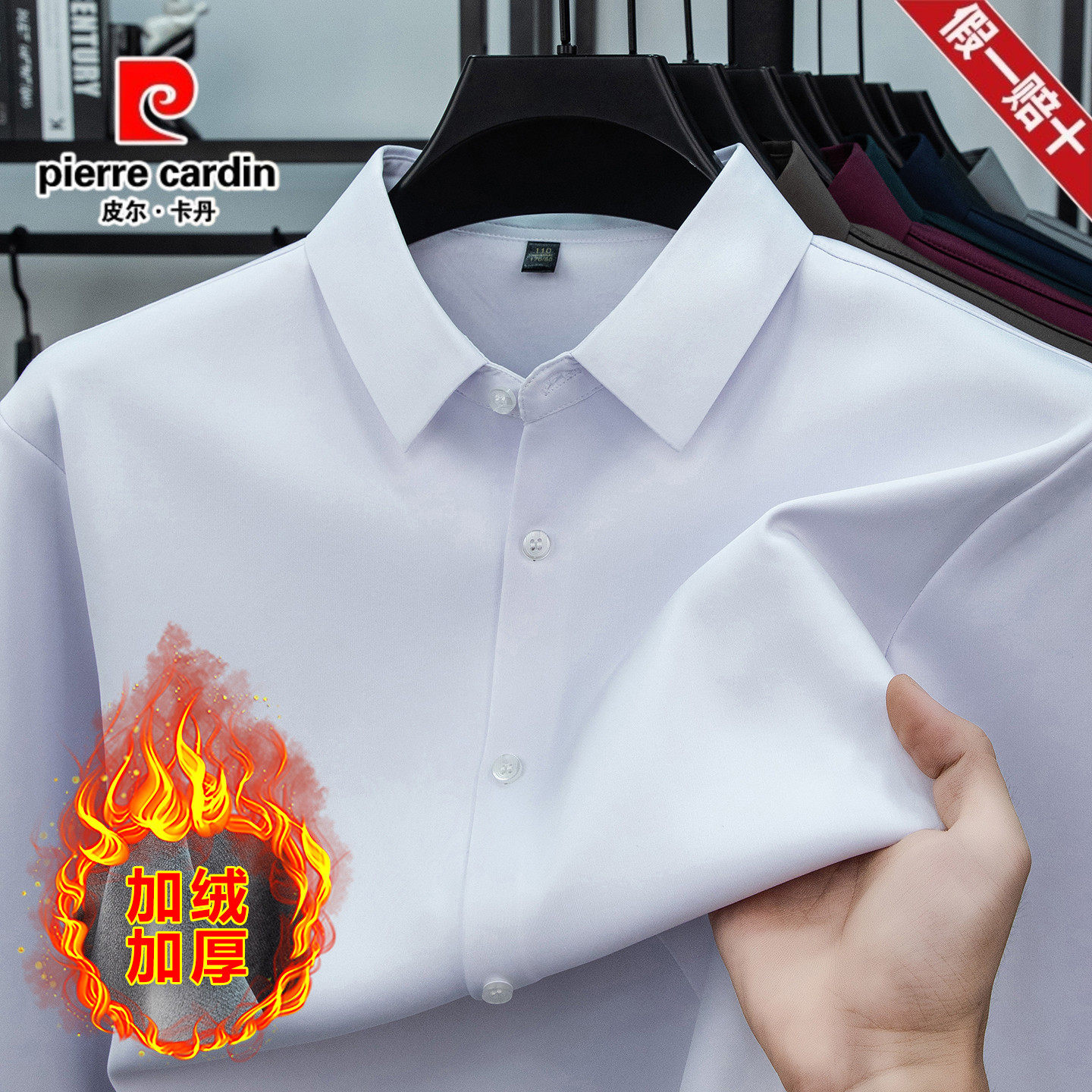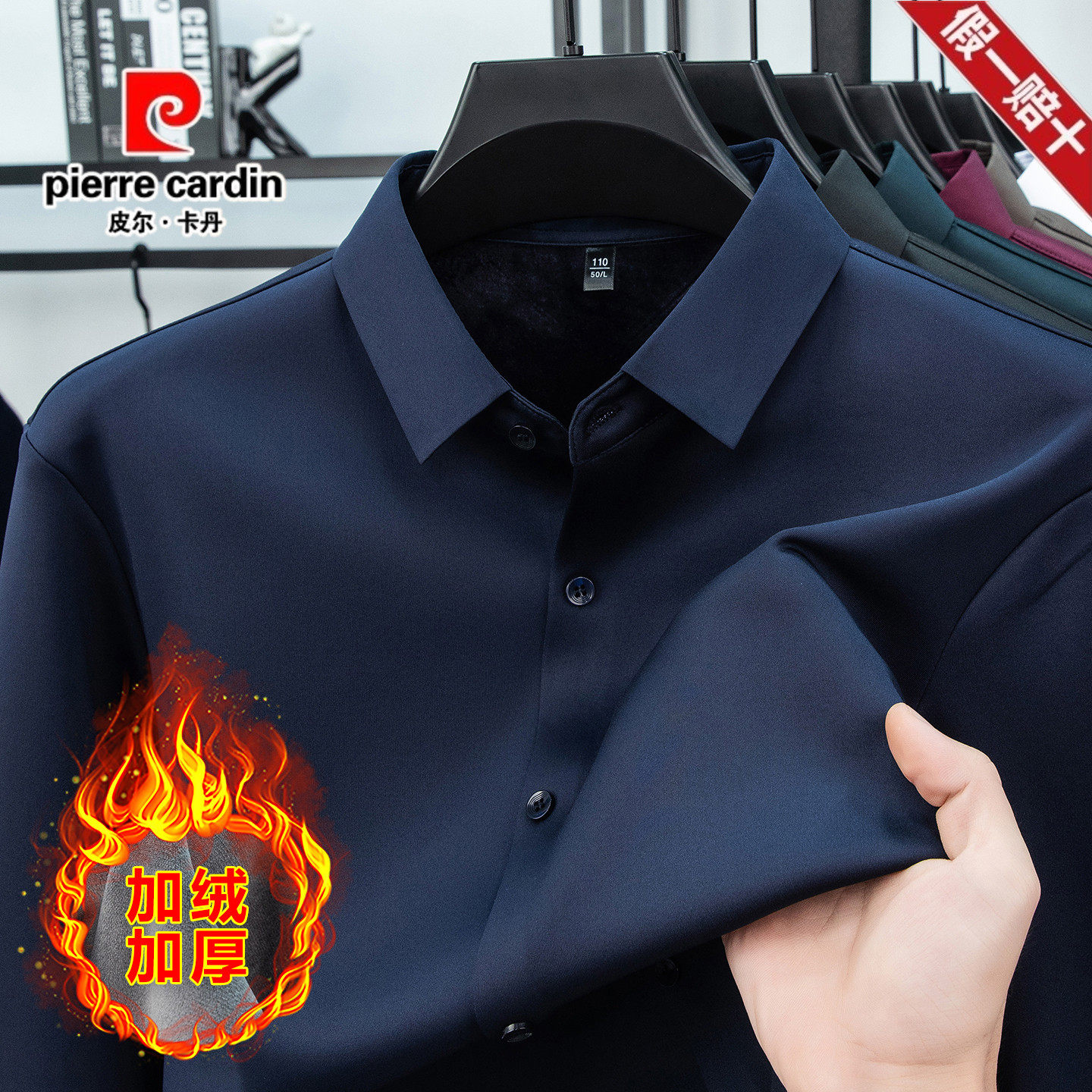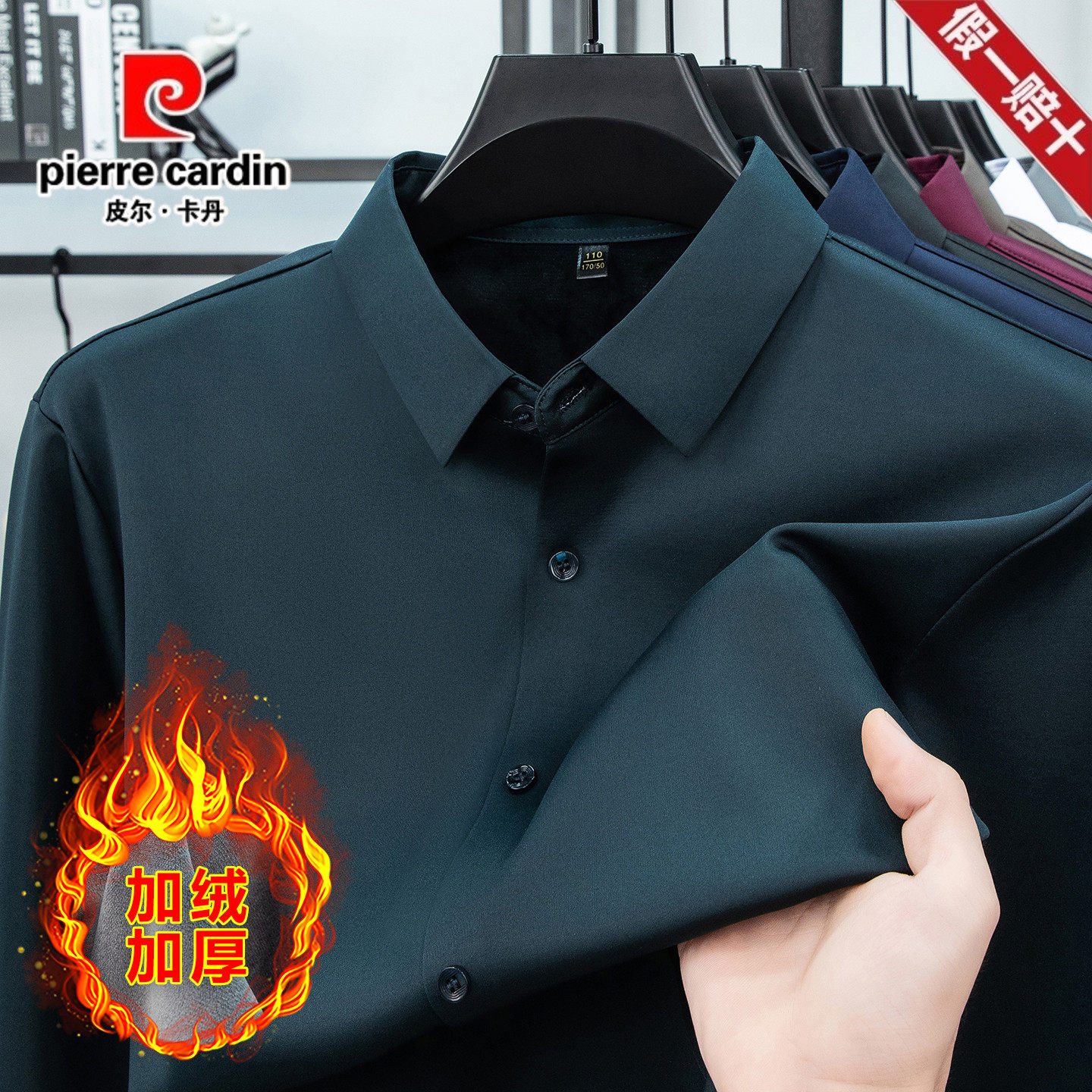 皮尔卡丹男士无痕加绒加厚长袖衬衫冬季新款纯色衬衫商务休闲上衣