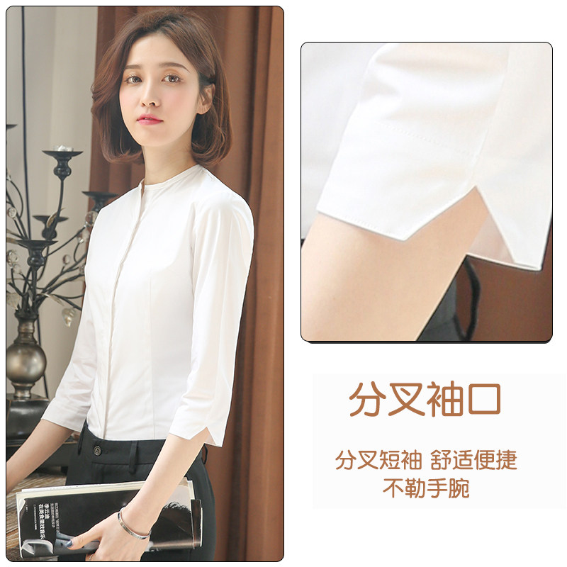 白色七分袖衬衫女圆领职业正装工作服新款上班工装无领中袖白衬衣