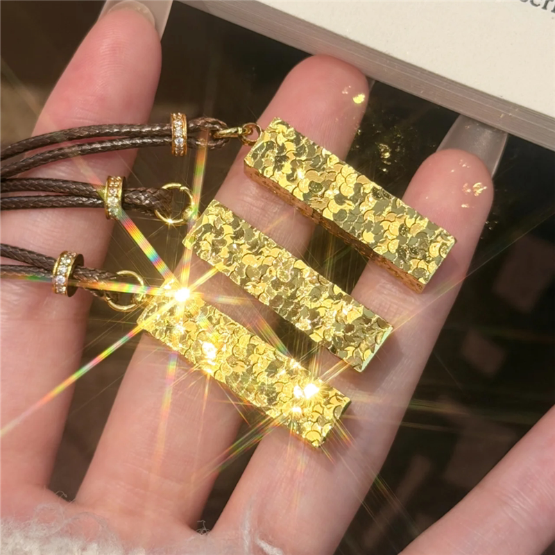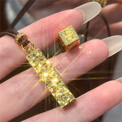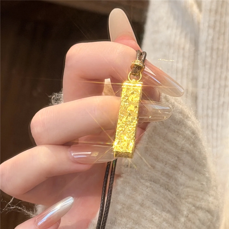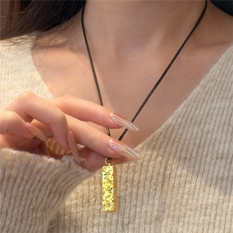 999黄金色爆闪锤纹碎冰冰四方来财小金条项链女印章小金块毛衣链