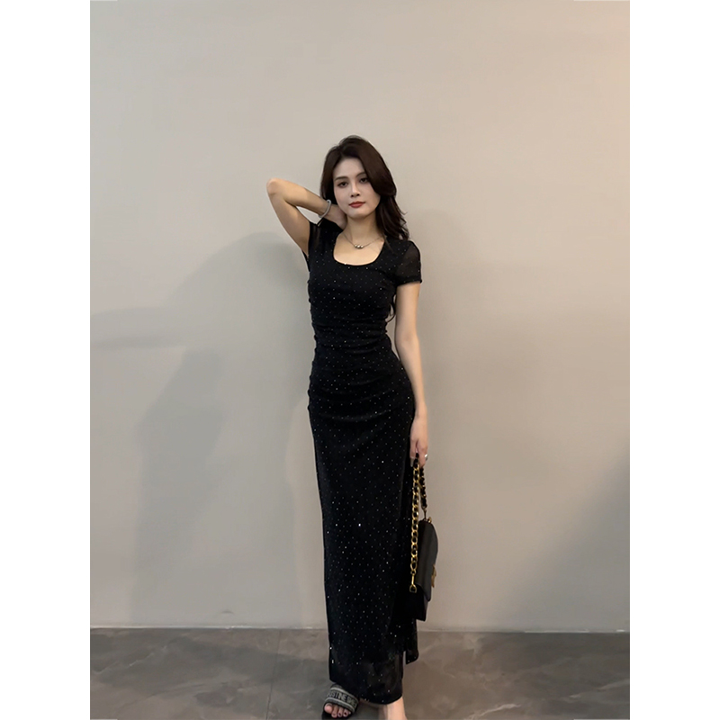 大婷婷 烫钻短袖长裙时尚设计师修身夏季连衣裙轻奢名媛DT1209