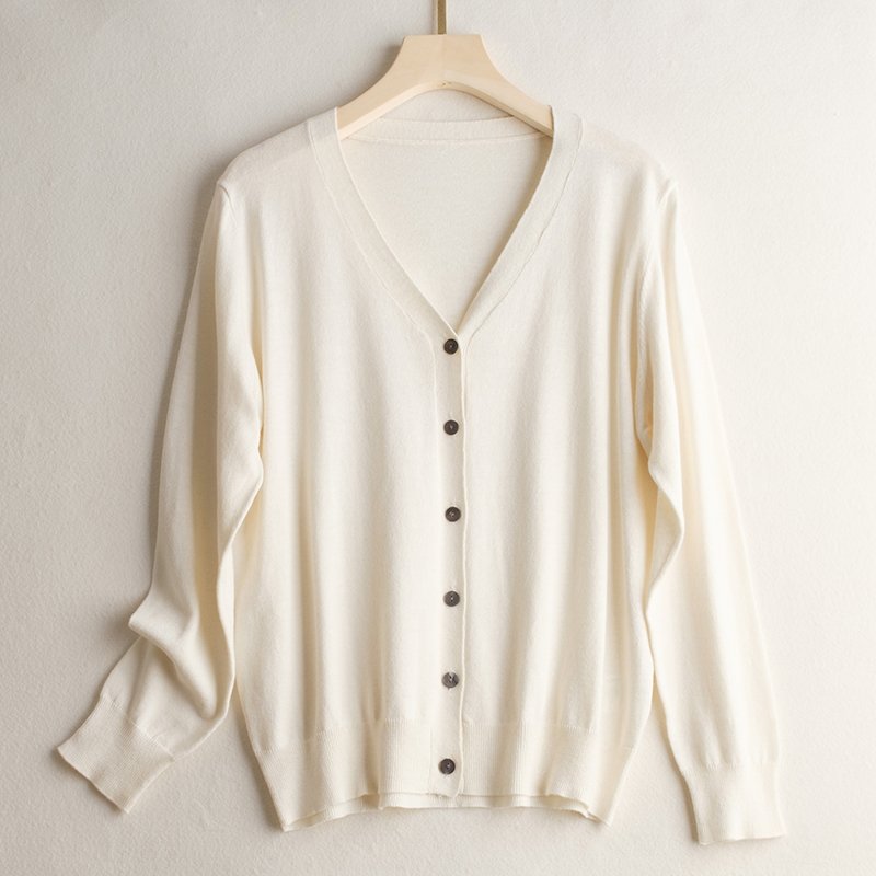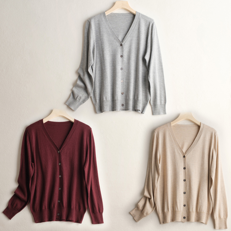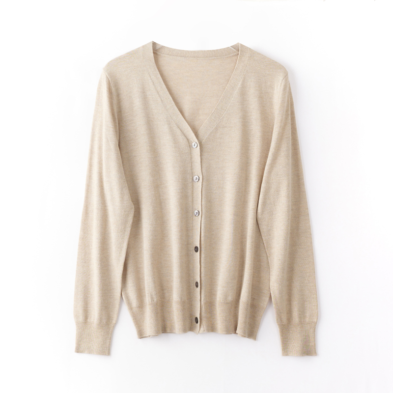 真丝羊绒混纺针织开衫春秋冬季纯色百搭V领薄外套单排扣宽松毛衣