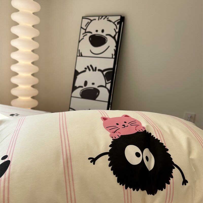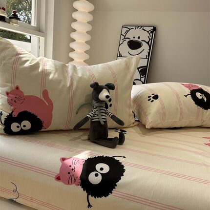 少女心粉条纹黑煤球小猫纯棉床笠床单单件1.35保护套全棉宿舍床罩