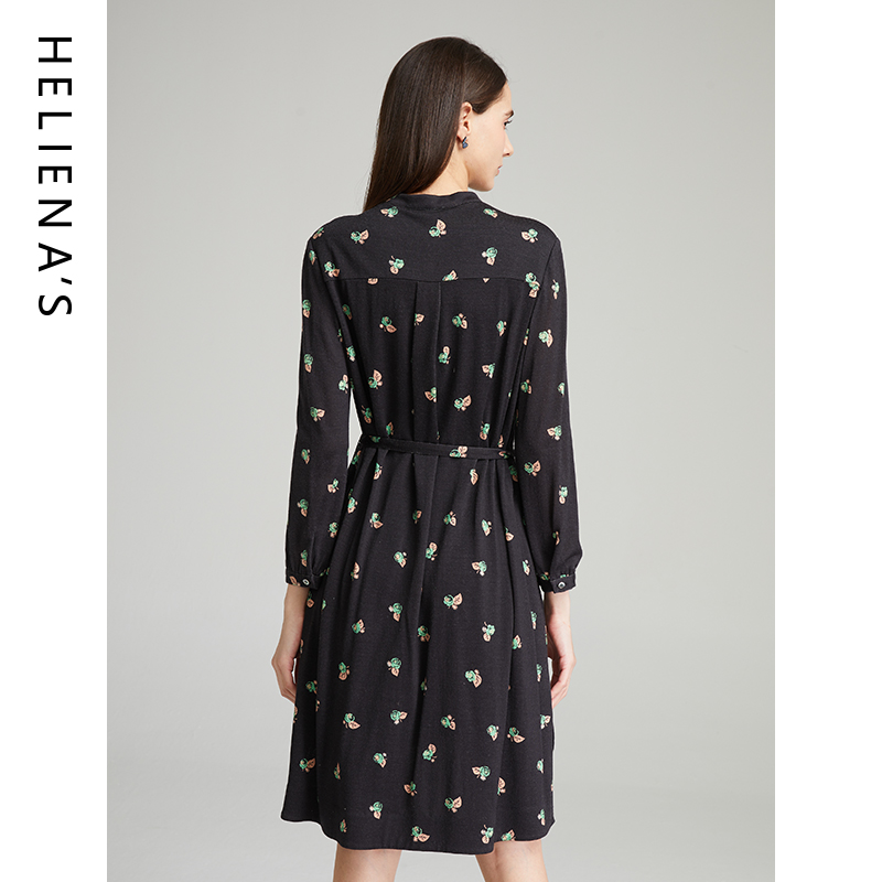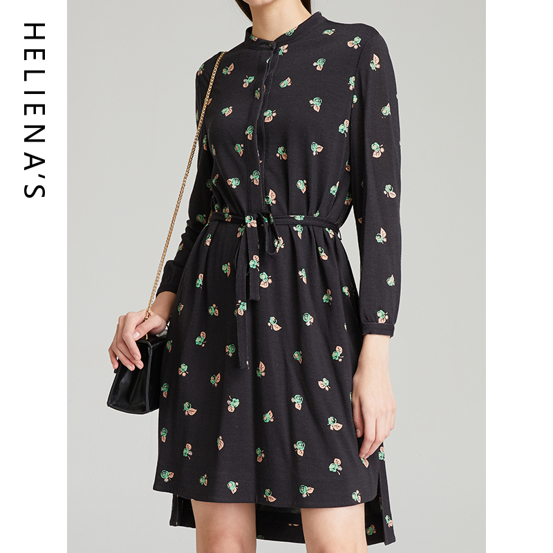 商场同款海兰丝2024秋冬款长袖羊毛碎花连衣裙系带显瘦衬衫打底裙