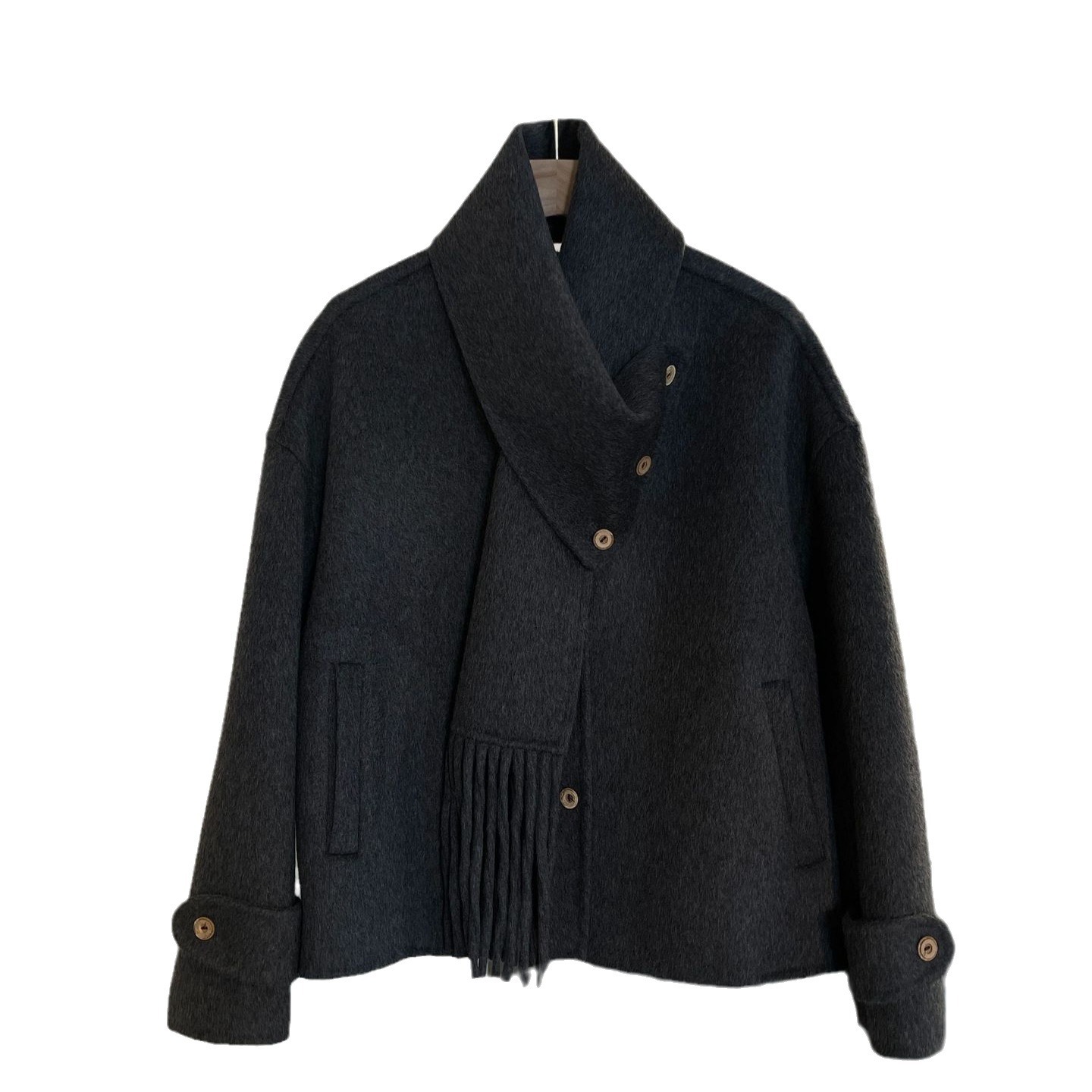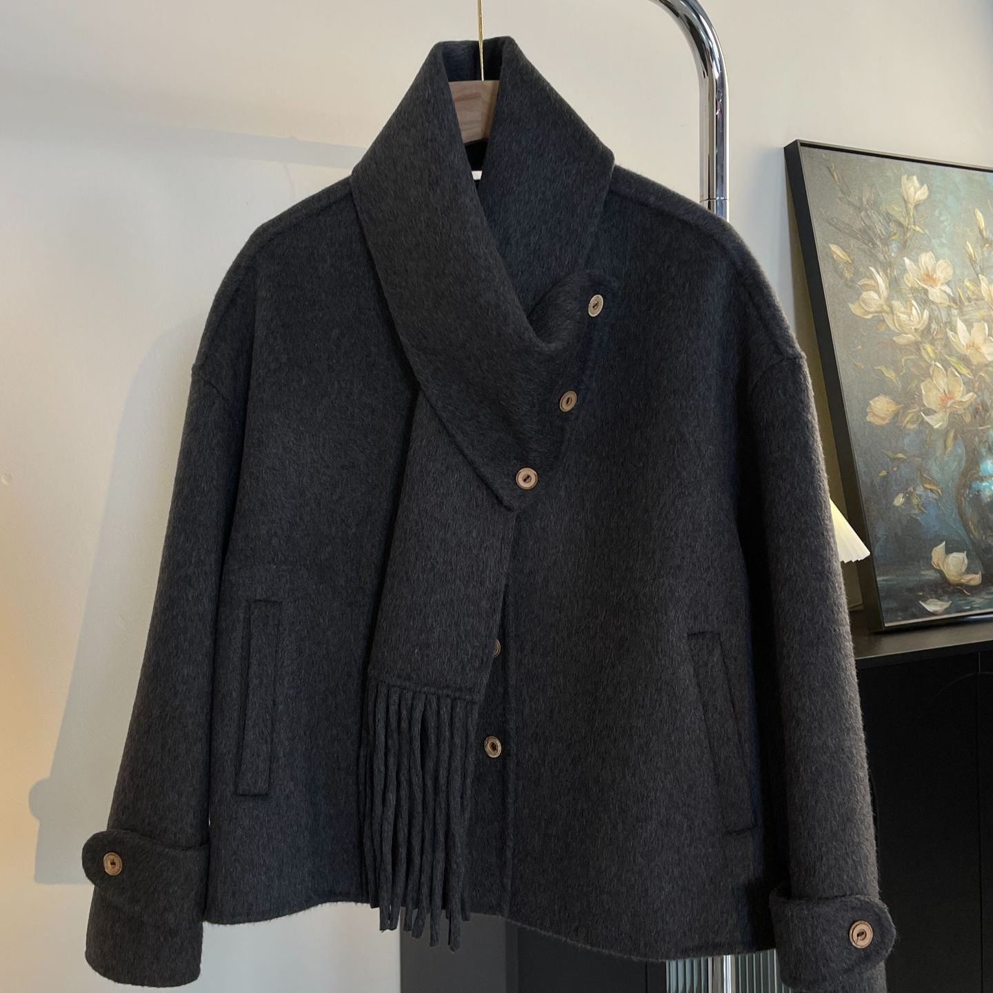 秋冬毛呢外套新款流苏围巾V领可脱卸双面羊绒大衣女宽松短款