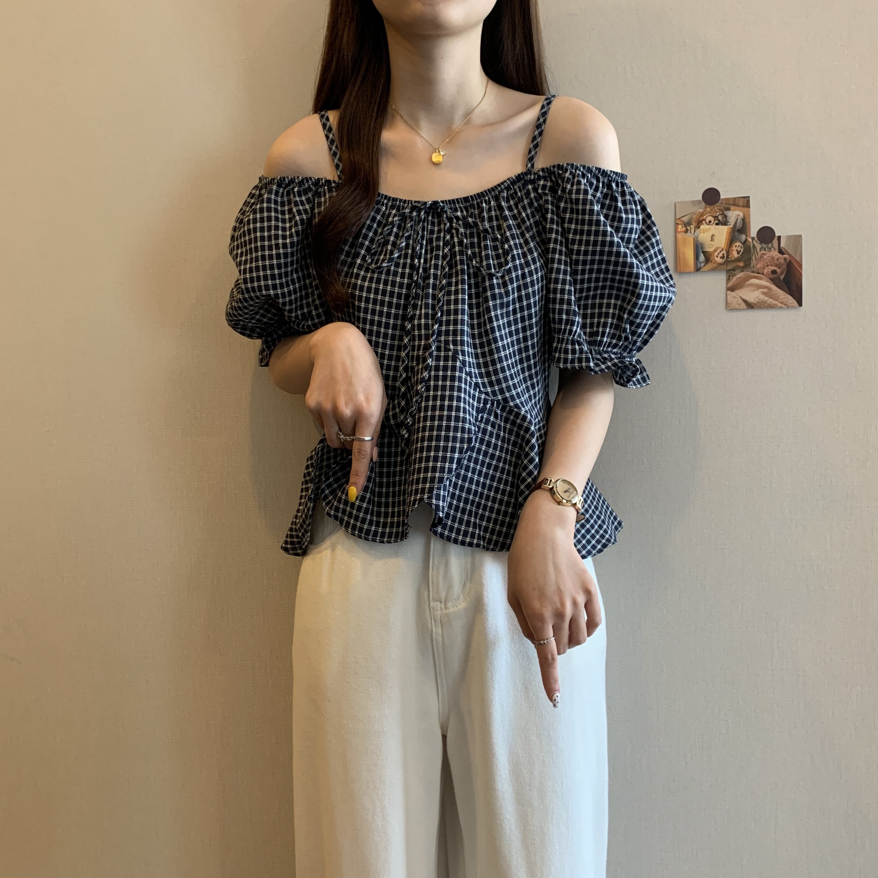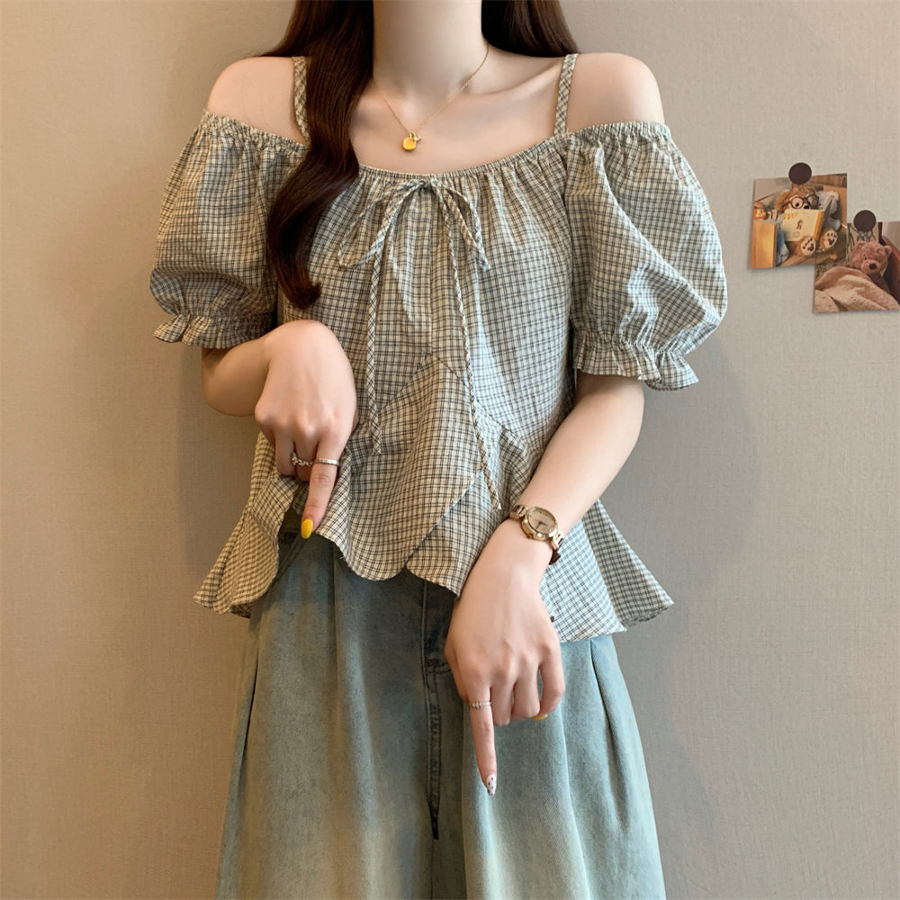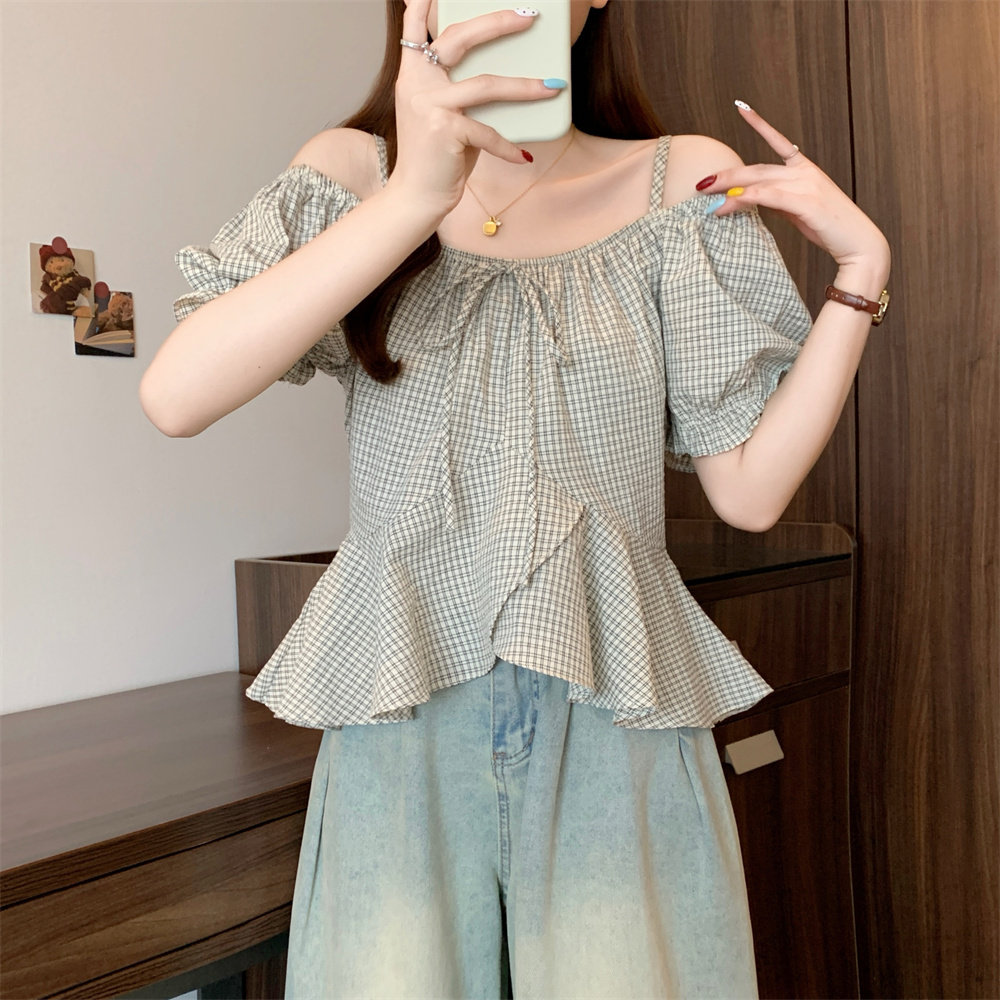实拍大码女装夏季韩版一字肩吊带露肩短袖上衣时尚百搭格子衬衫女