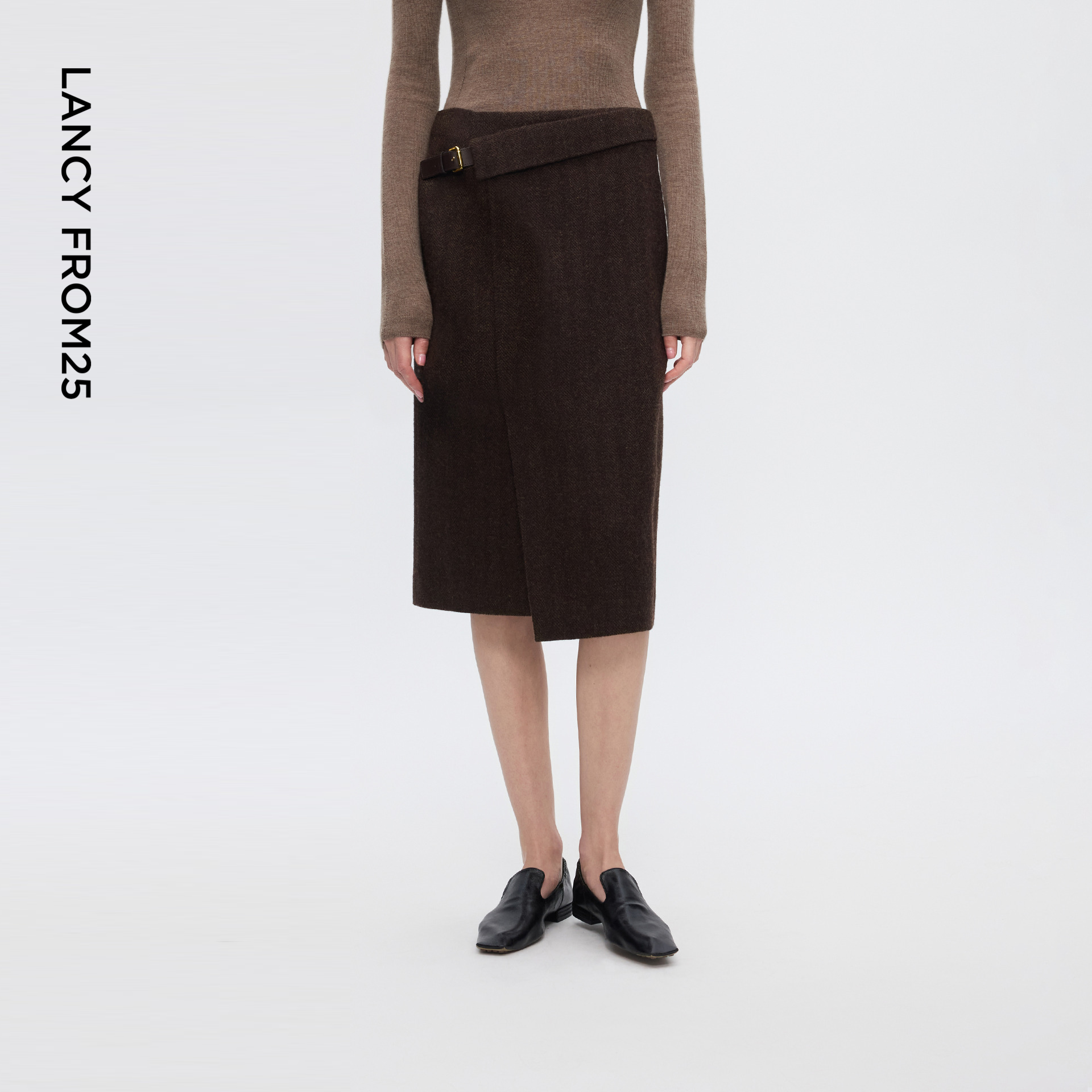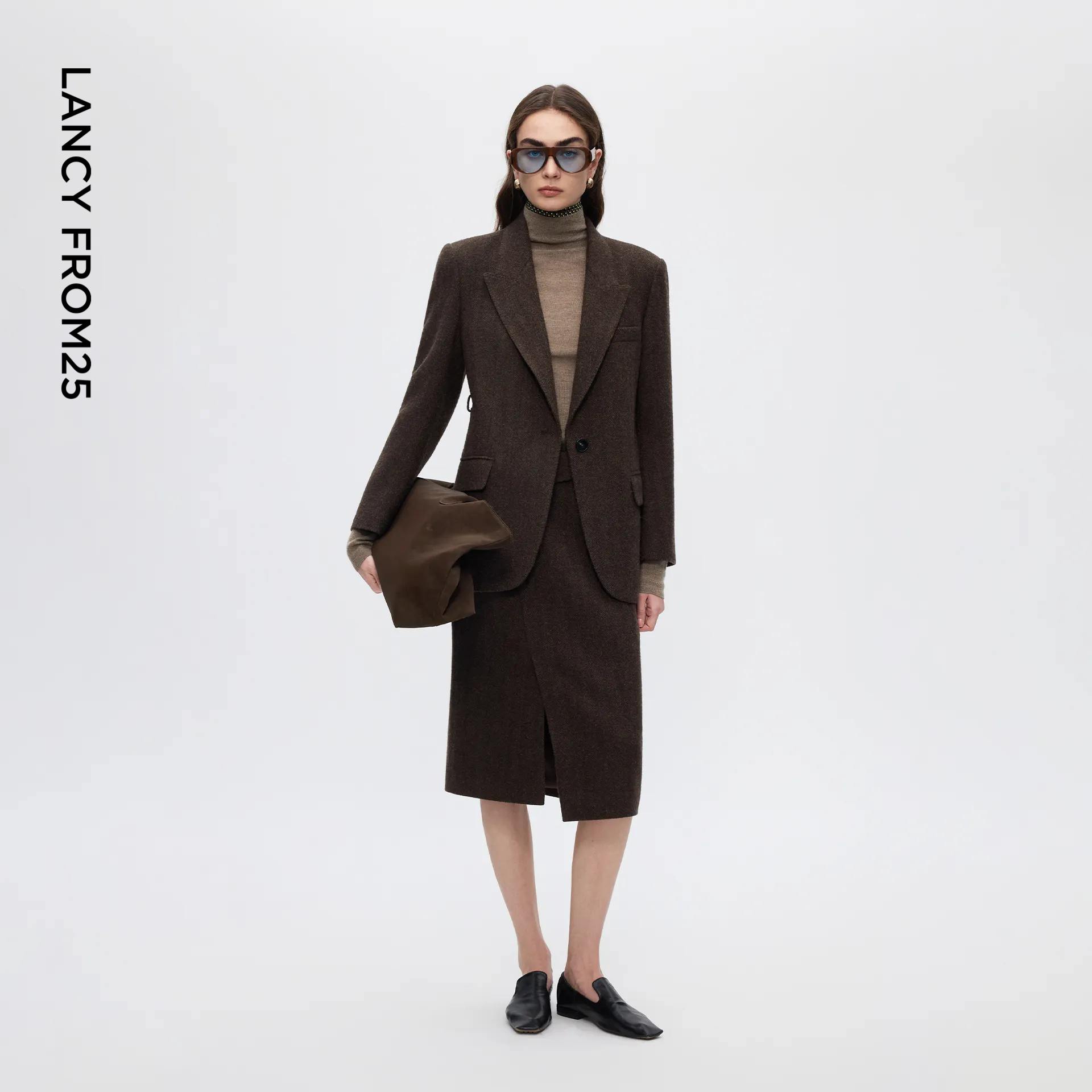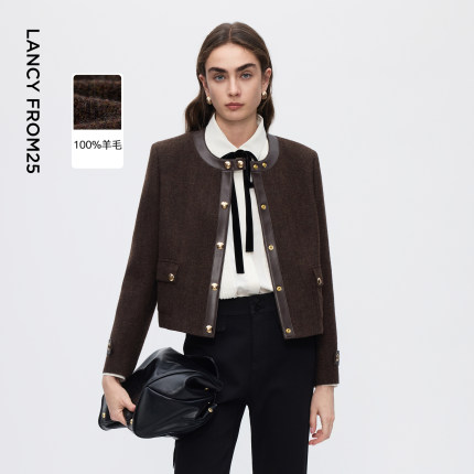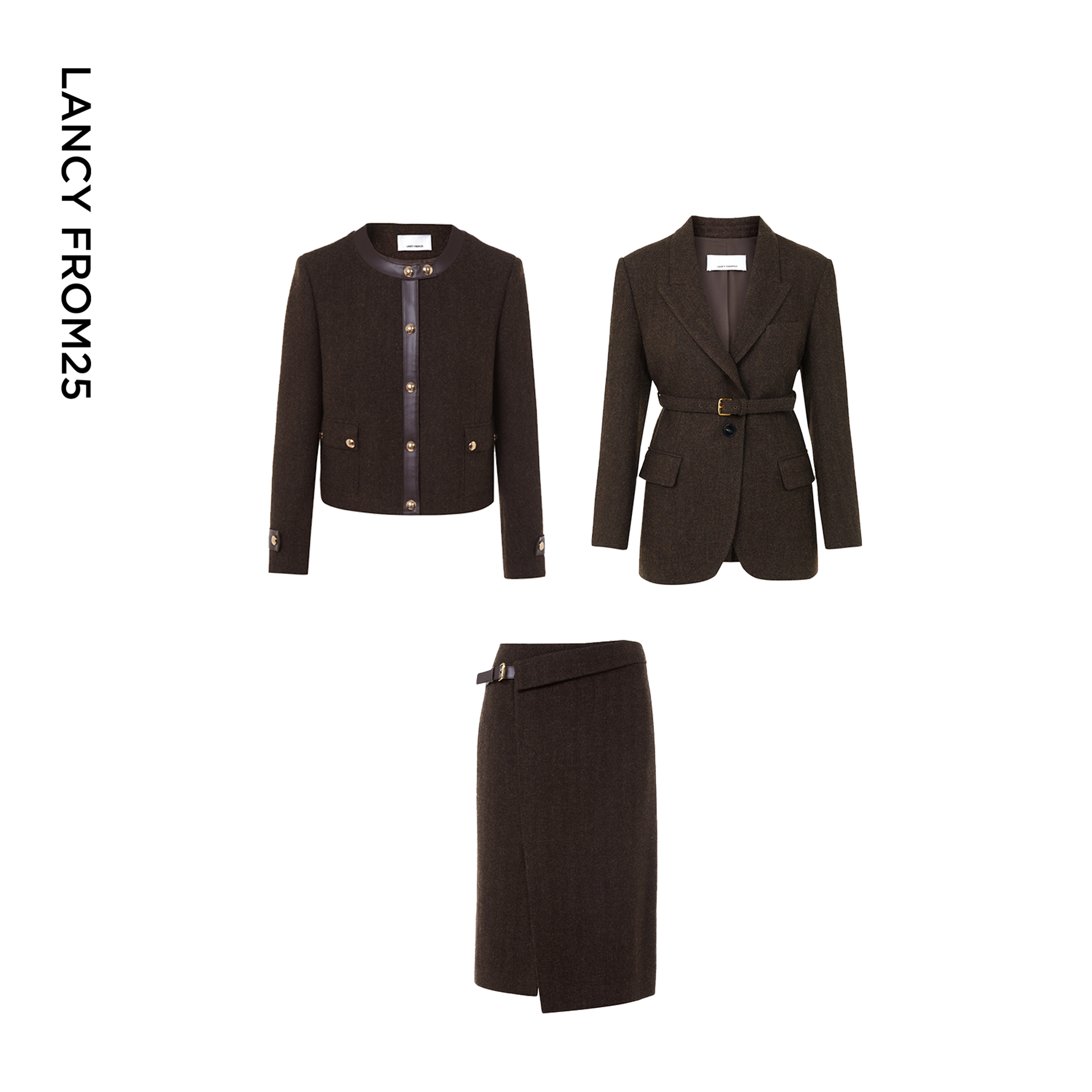 朗姿纯羊毛圆领短款通勤风西装/半身裙深咖色套装女2025冬季新款