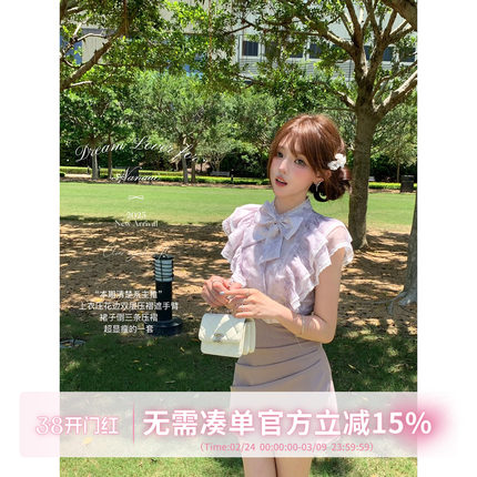 甜水仙 薄纱樱 定制蝴蝶结棉感微透双色衬衫半裙荷叶小飞袖套装女