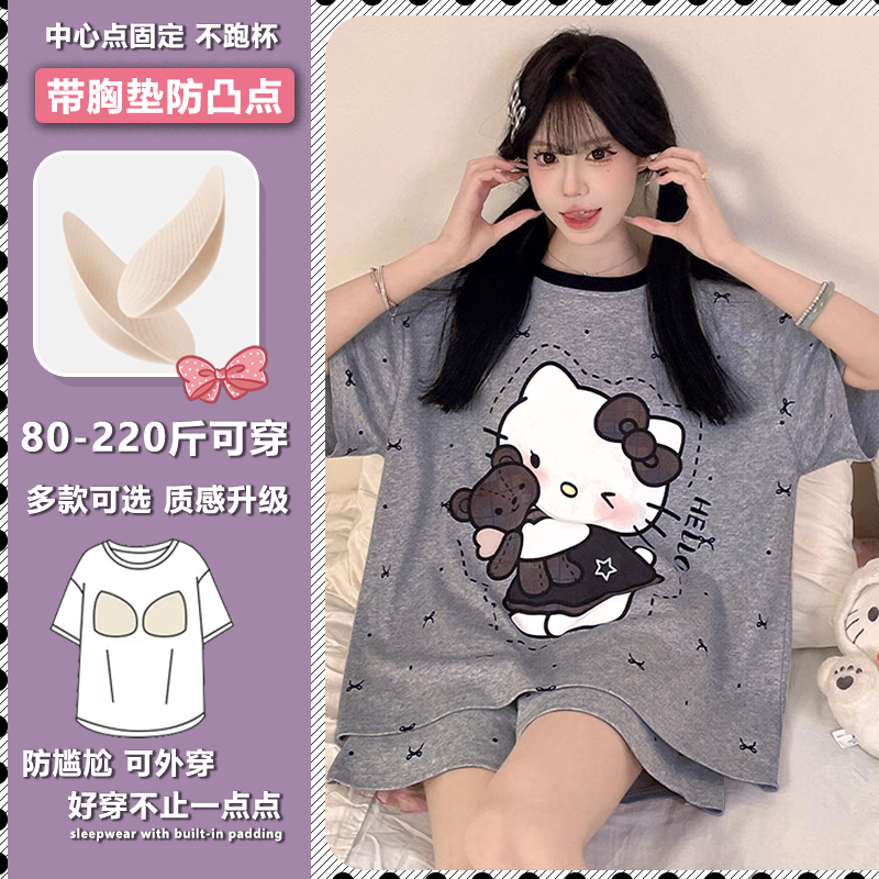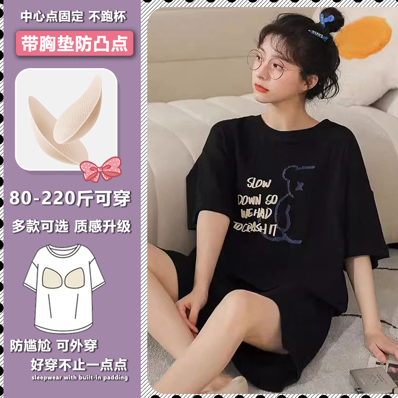 夏季网红ins棉感带胸垫短袖睡衣女甜美宽松大码家居服可外穿套装