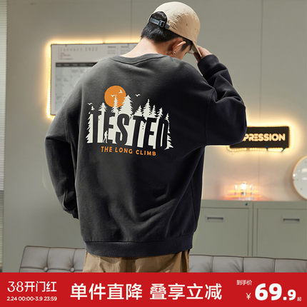 唐狮秋冬季新款圆领卫衣男士加绒长袖灰色青少年美式无帽潮DF