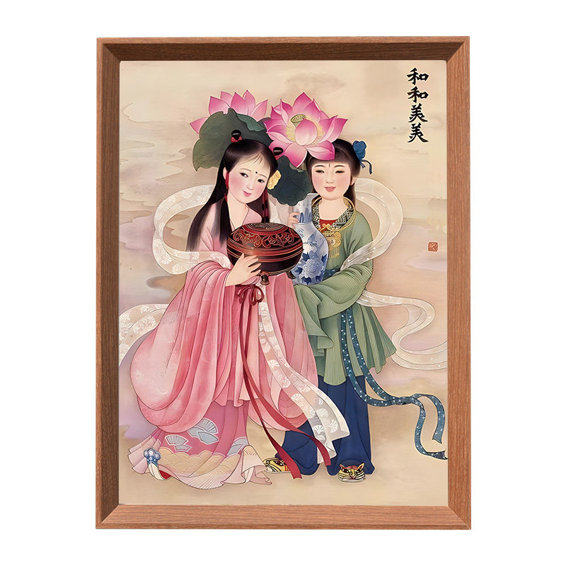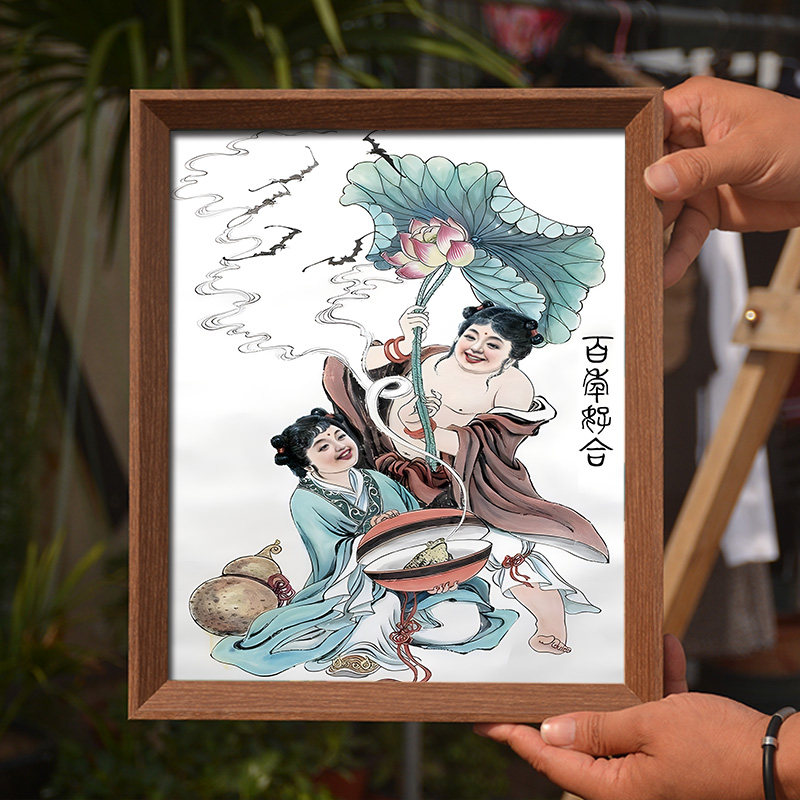 和合二圣画像挂画图旺姻缘夫妻和睦摆件家用供奉结缘摆台