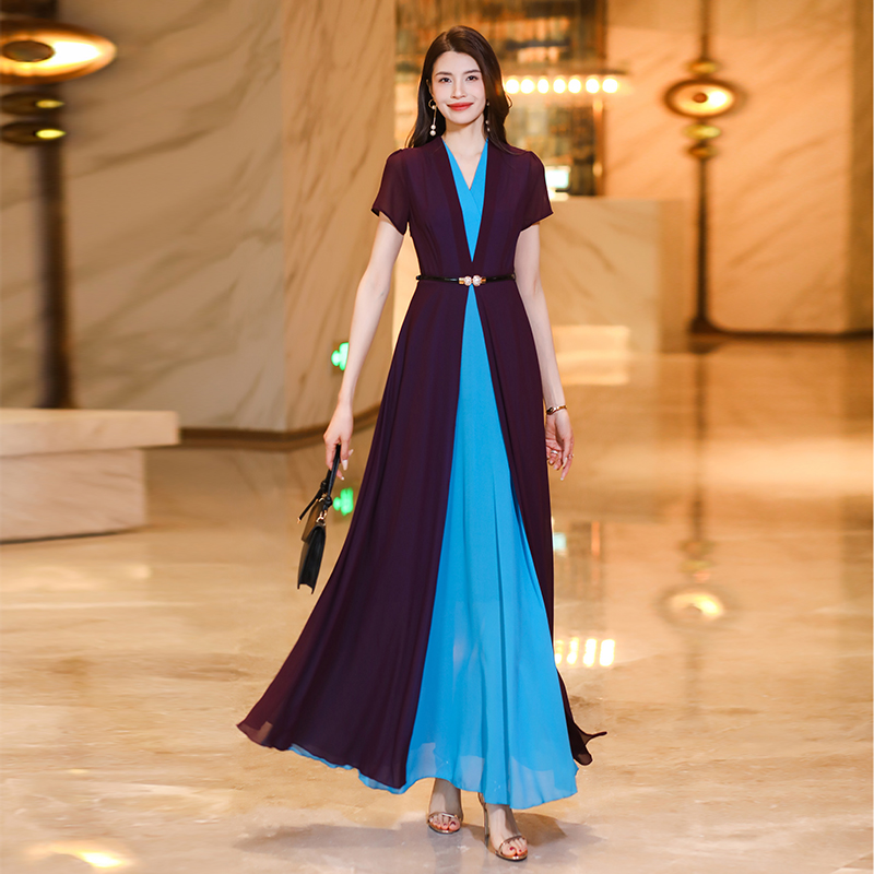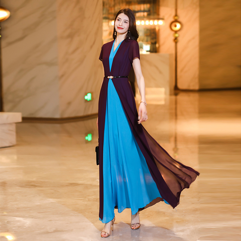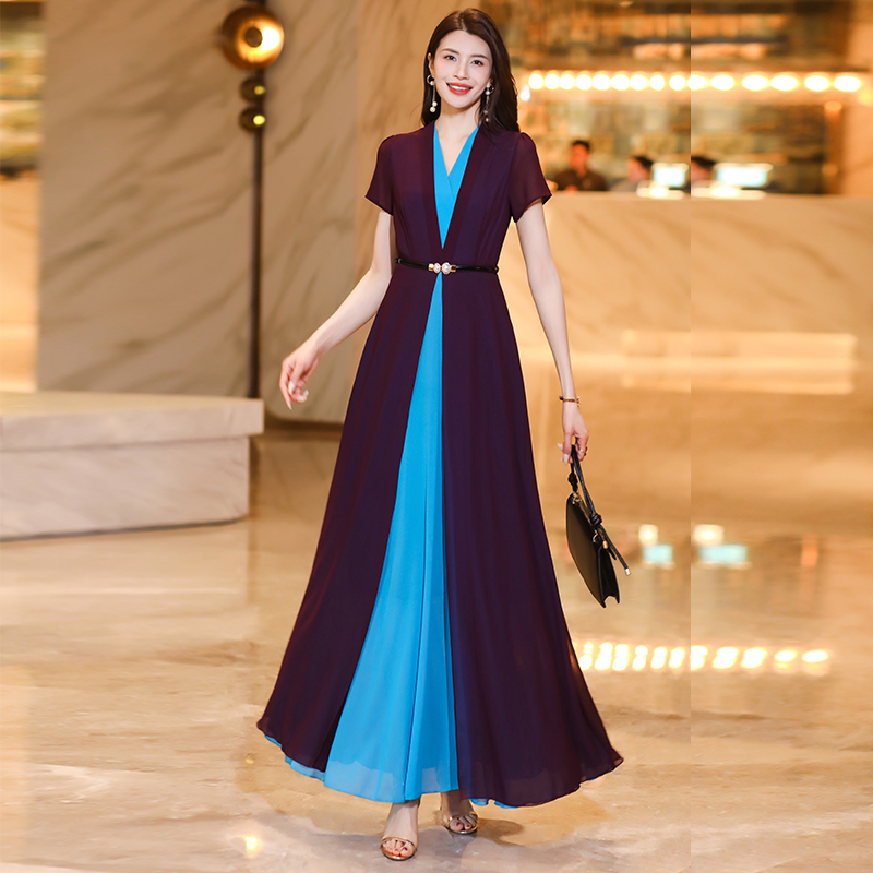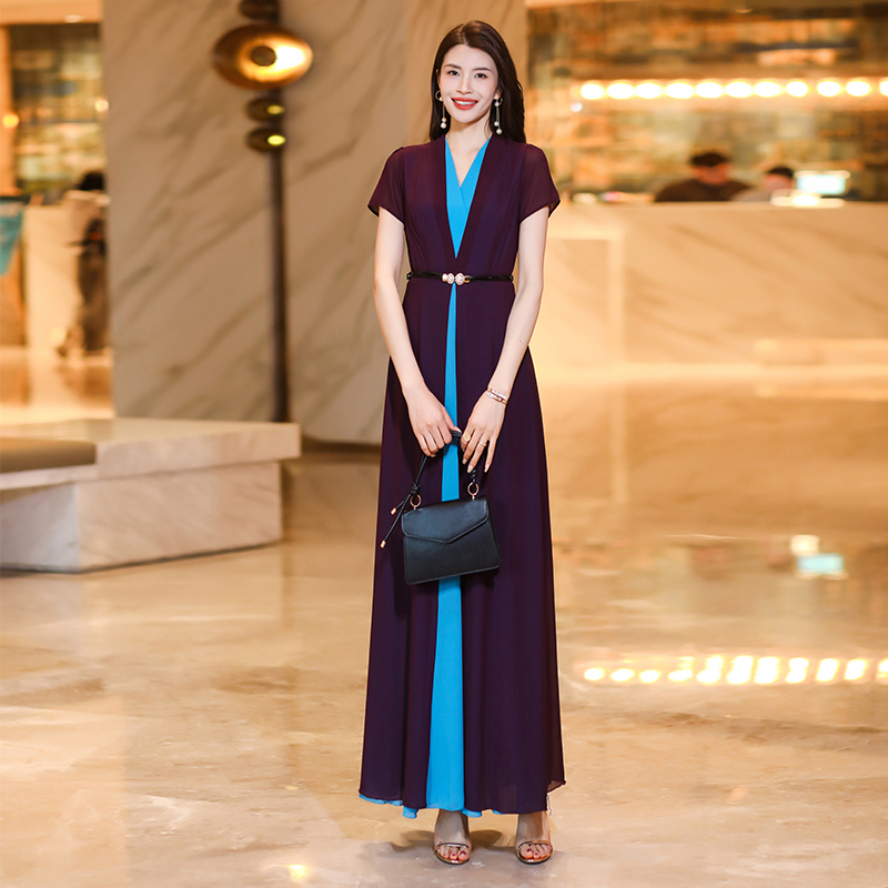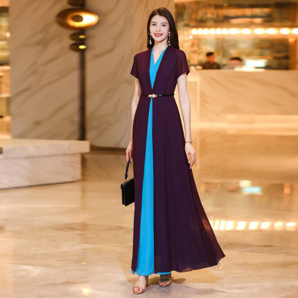 2025新款雪纺大摆长款连衣裙波西米亚紫色拼接修身显瘦长裙到脚踝