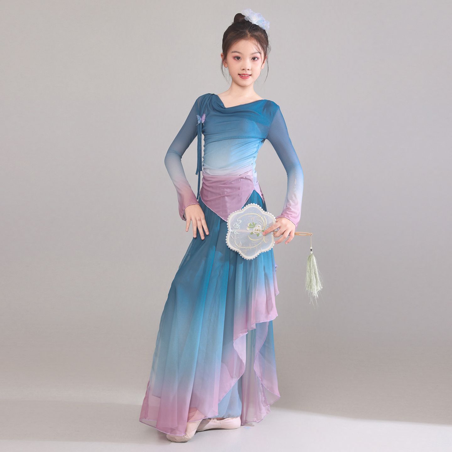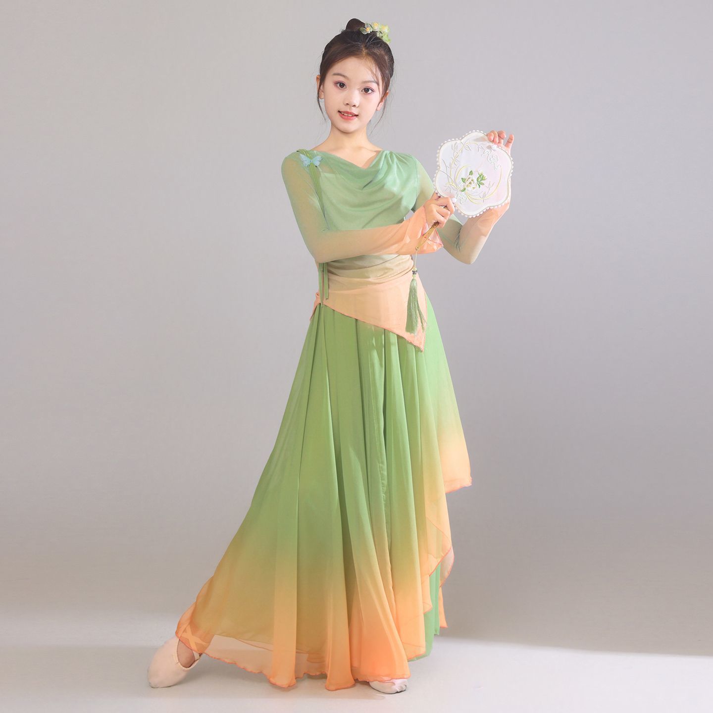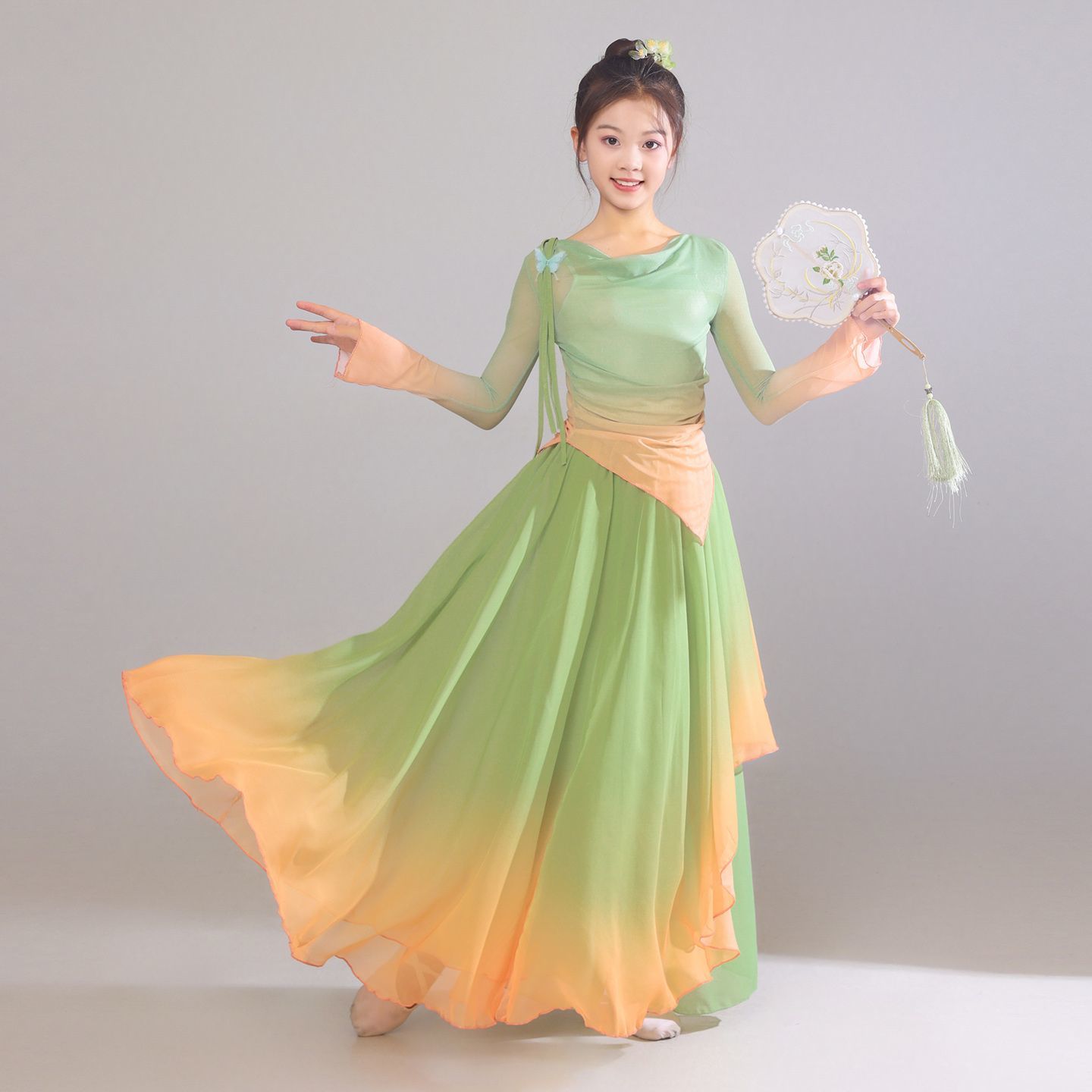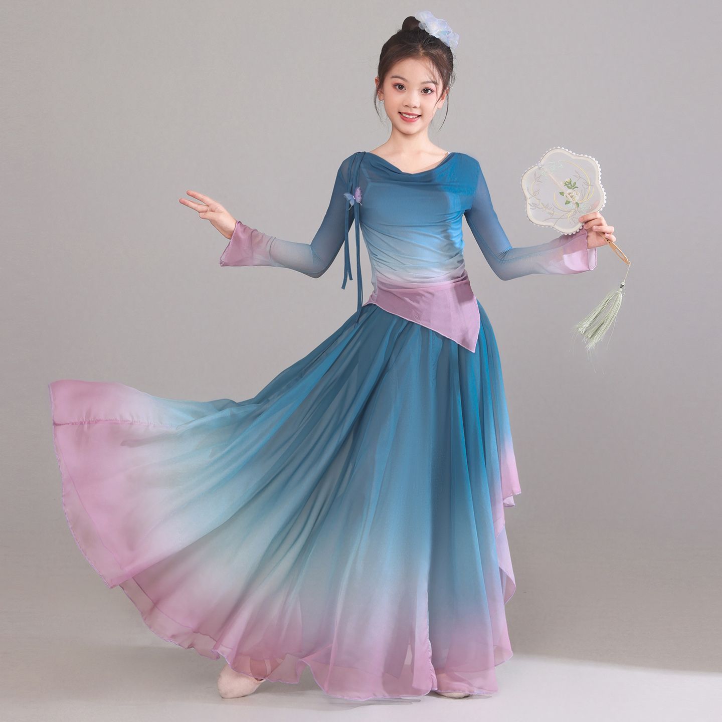 新款伞舞扇子舞儿童古典舞蹈服民族舞蹈服渐变色大摆裙练功表演服