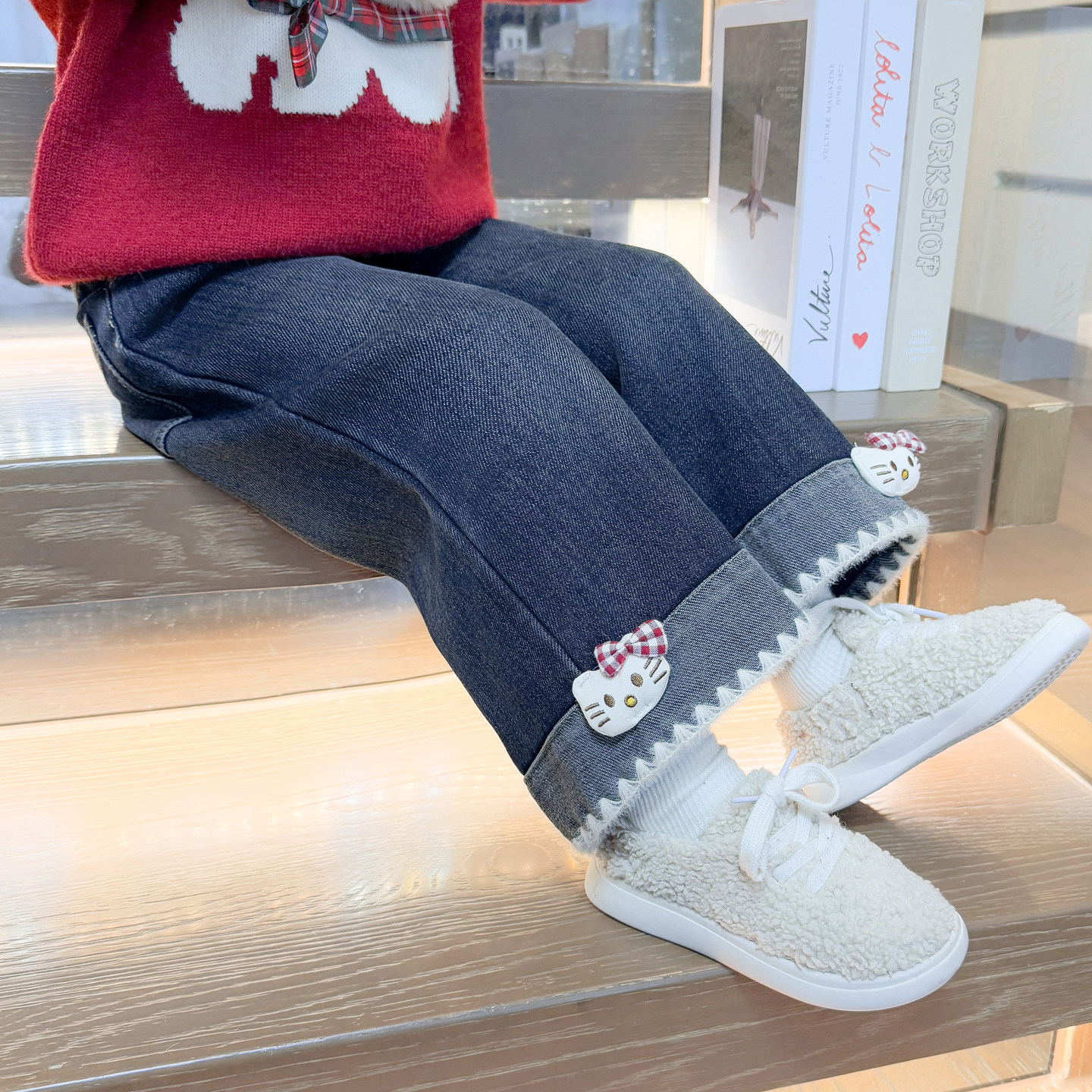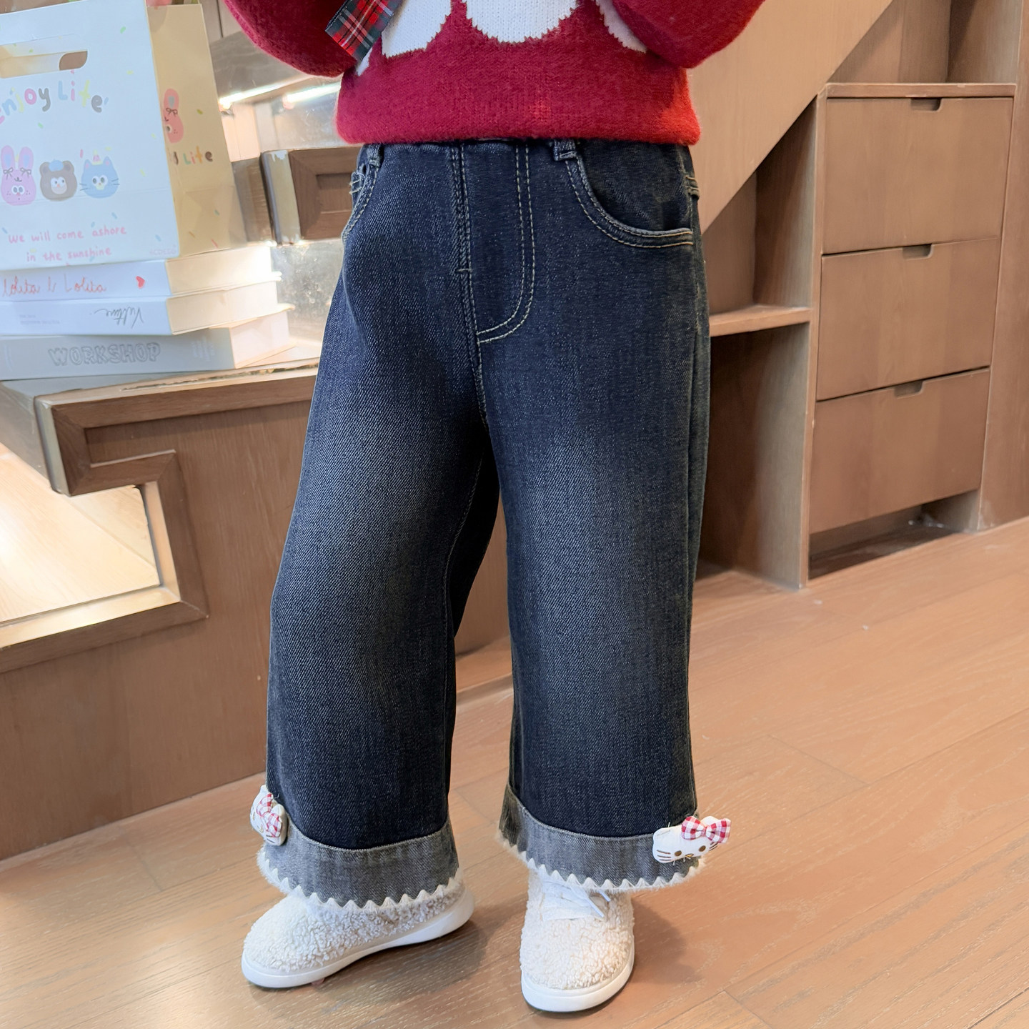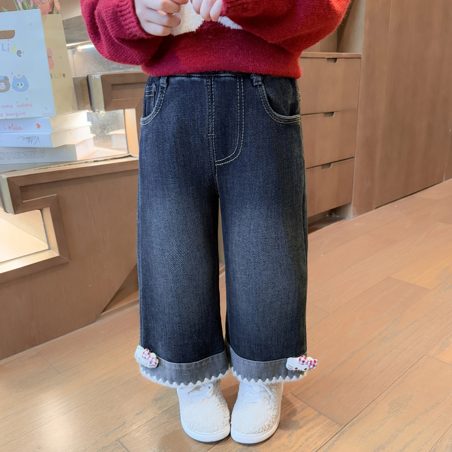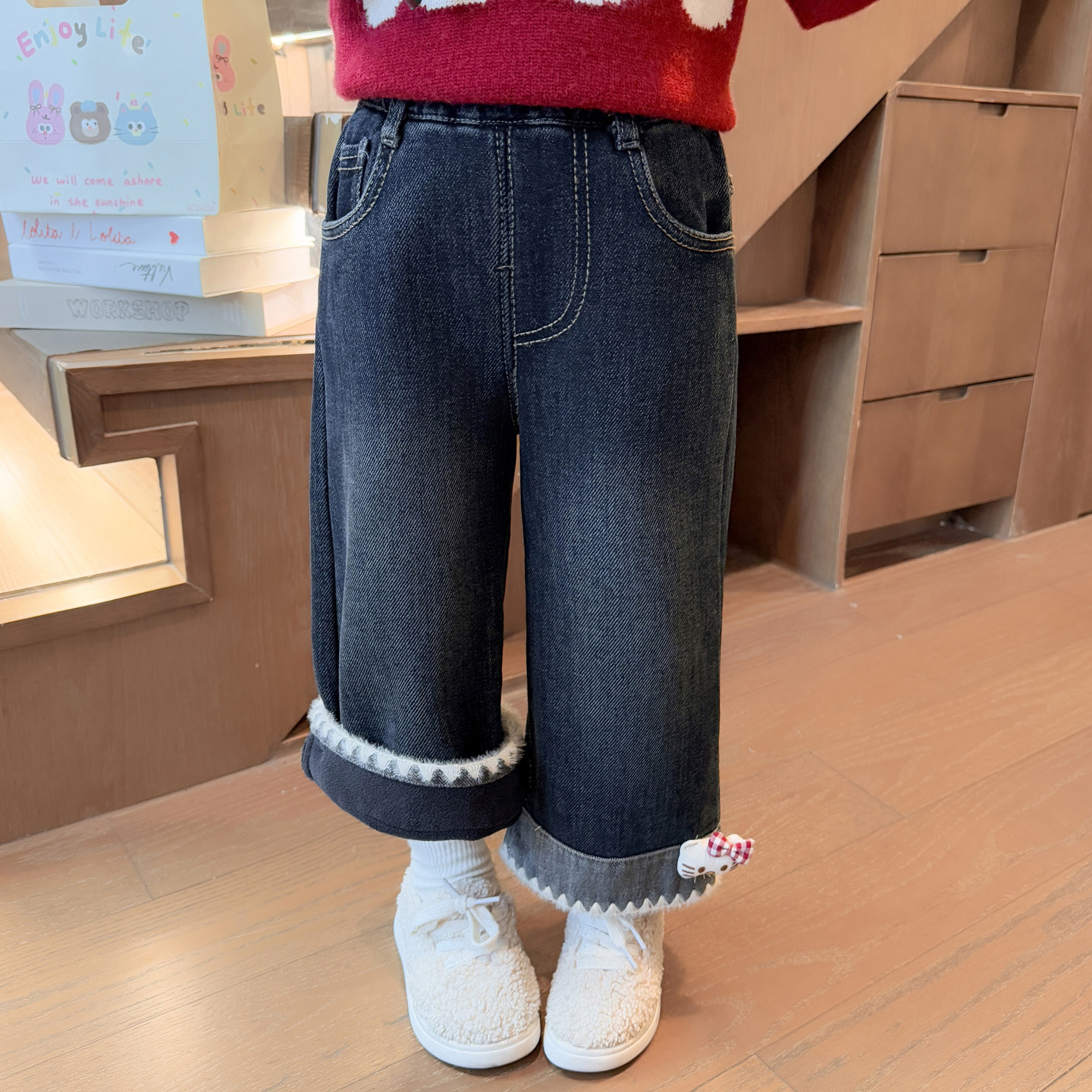 女童加绒裤子秋冬儿童一体绒牛仔裤2025新款洋气女宝宝加厚阔腿裤