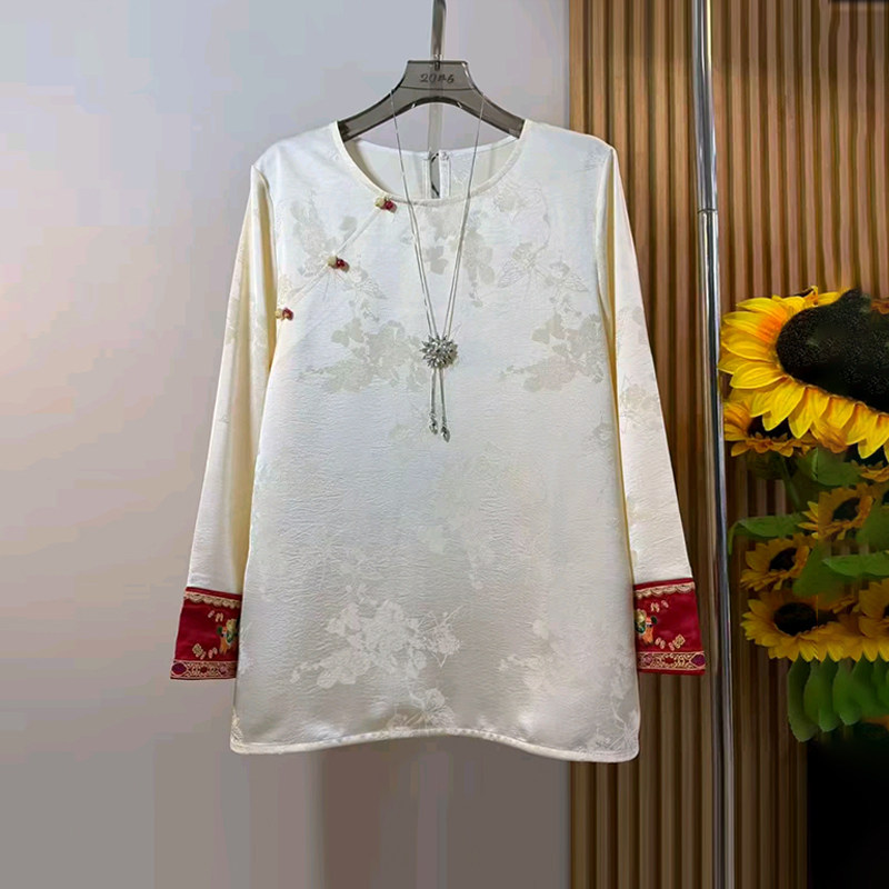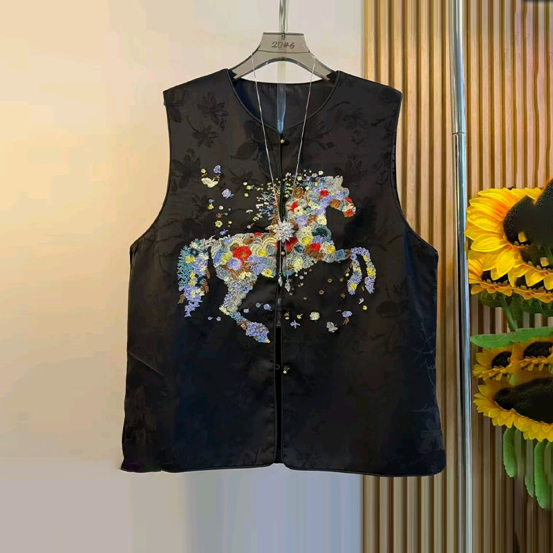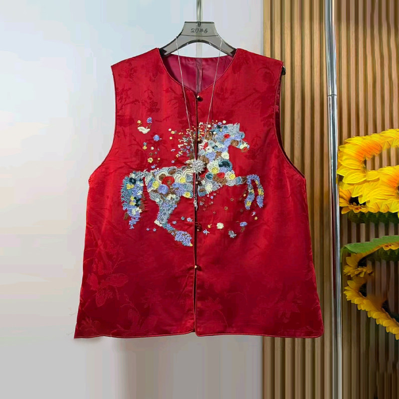 加肥刺绣图案国风马甲胖妹妹2026新年款洋气百搭拼色袖口暗花小衫