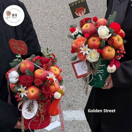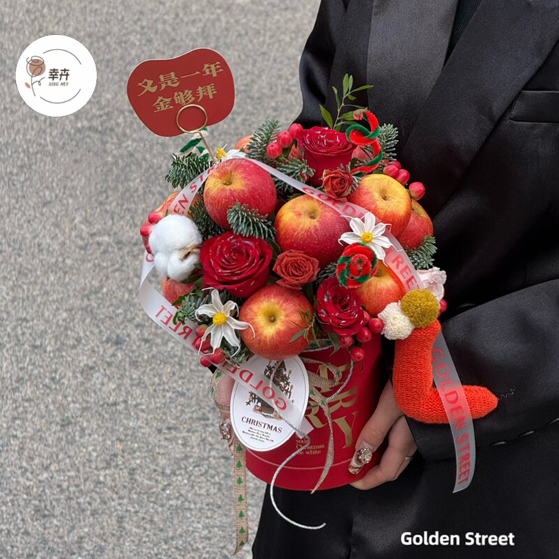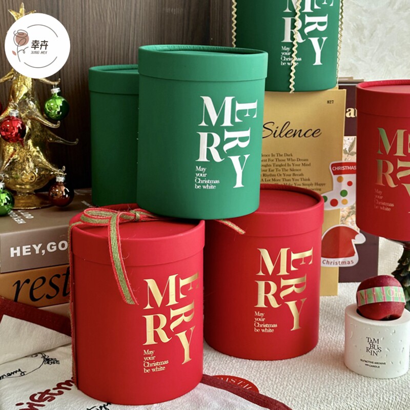 圣诞节苹果盒圆形抱抱桶花盒平安夜礼物鲜花包装盒草莓塔插花礼盒