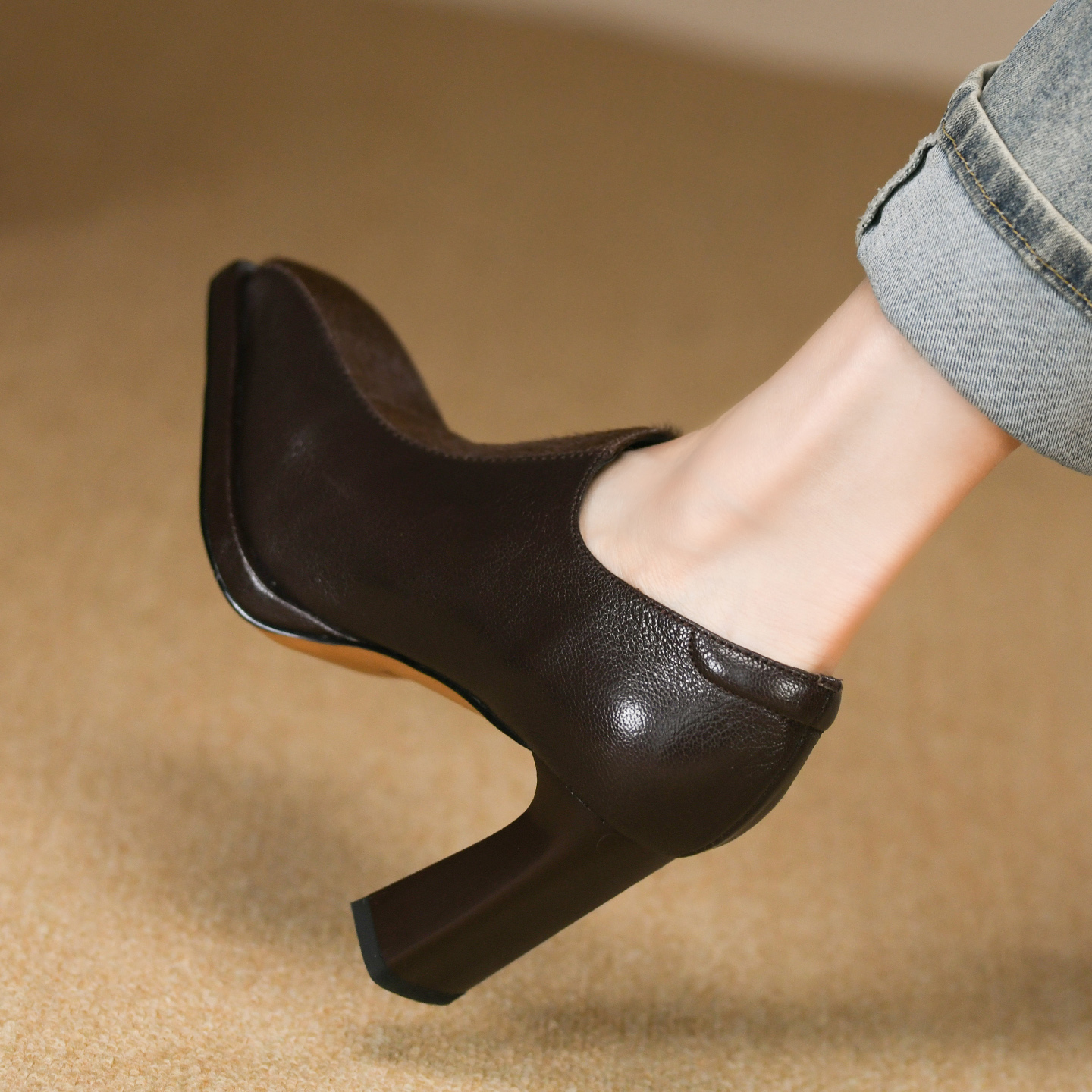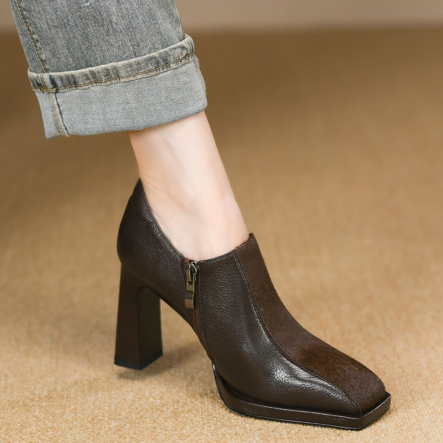 复古棕色方头深口单鞋女粗跟秋季新款侧拉链拼接真皮马毛高跟鞋女