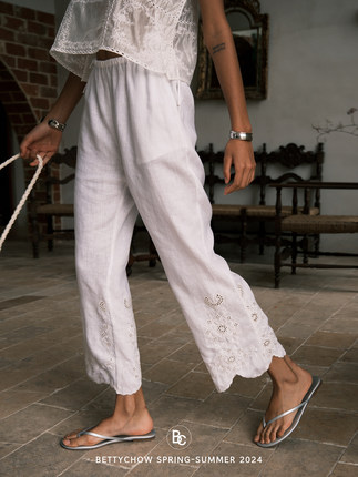 Bettychow 丝麻刺绣白色9分休闲阔腿裤法式通勤夏季时尚长腿神裤
