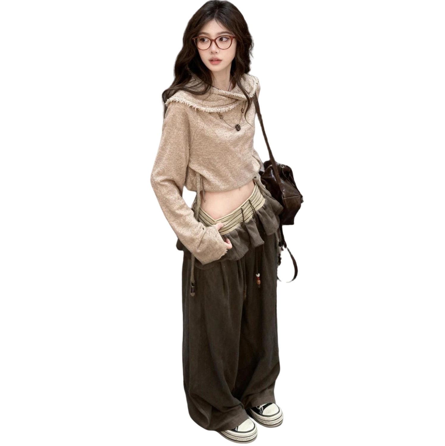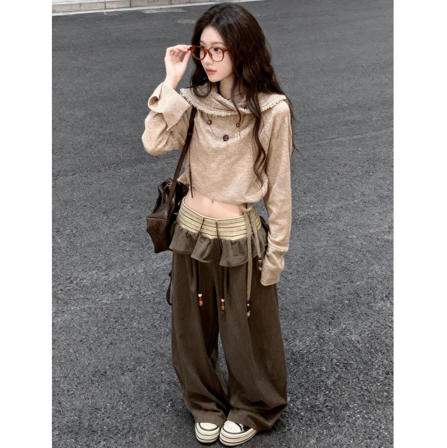 美式复古时尚风毛边翻领长袖针织卫衣女学生搭配荷叶边棕色阔腿裤