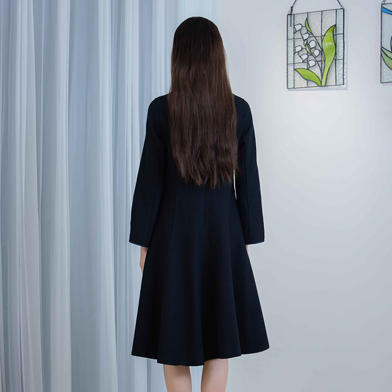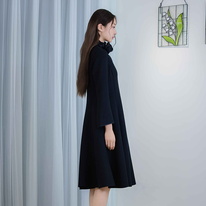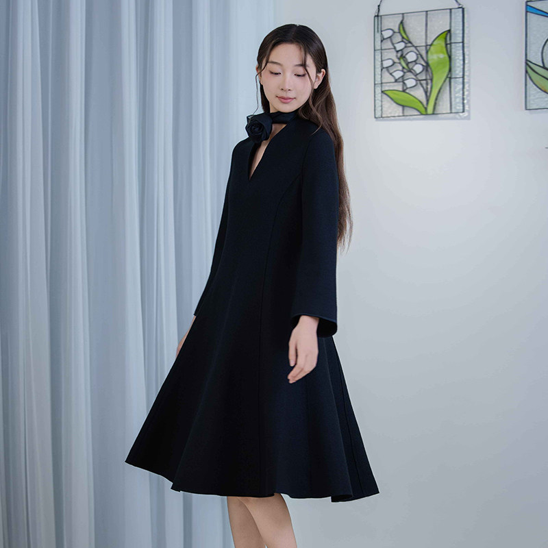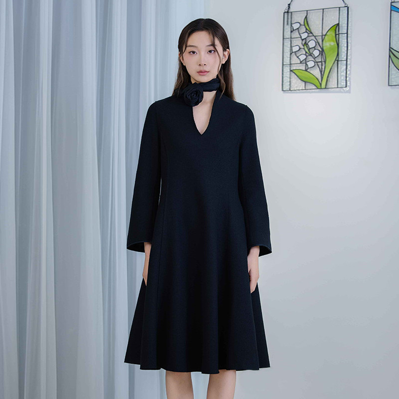 丝巾羊毛混纺黑色V领收腰连衣裙