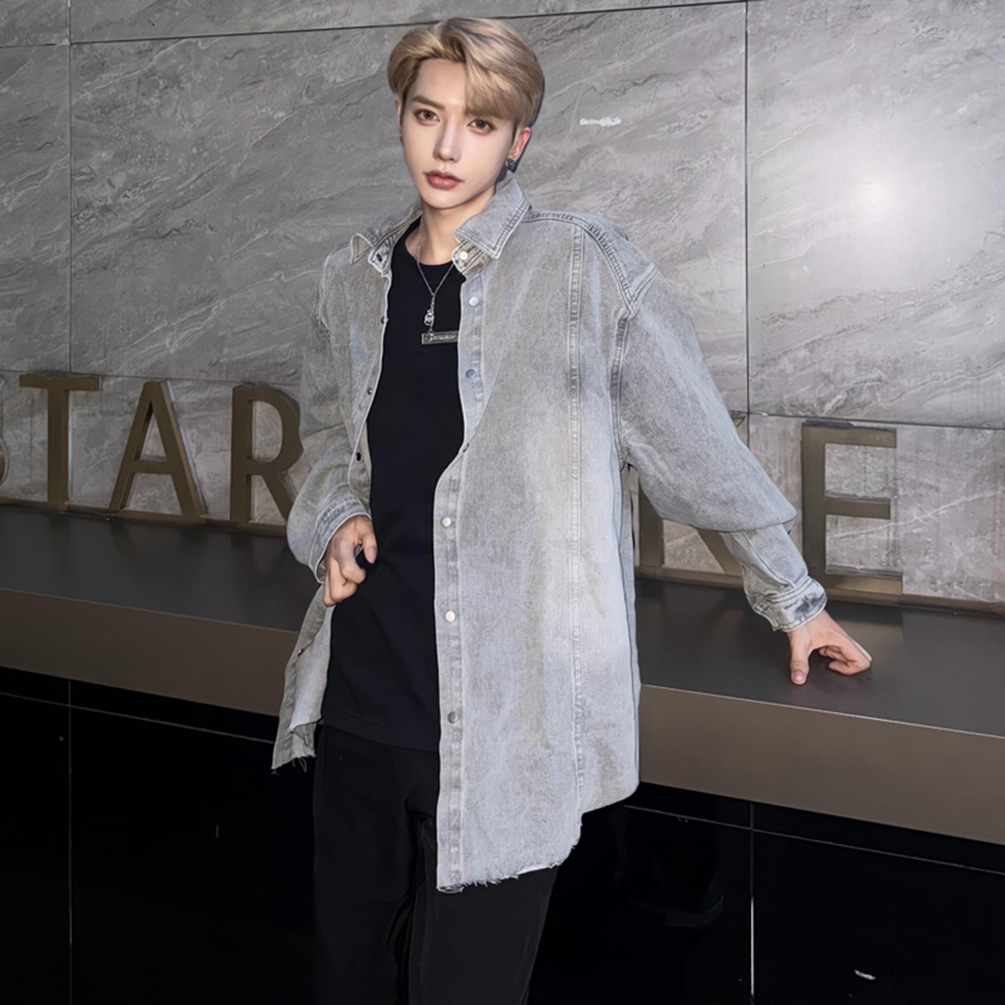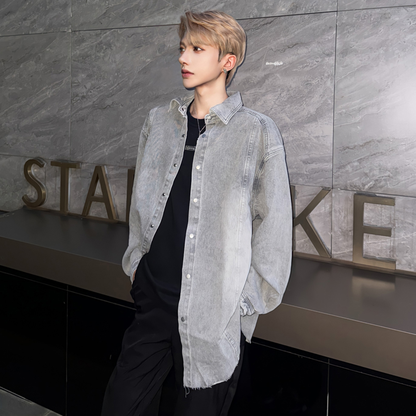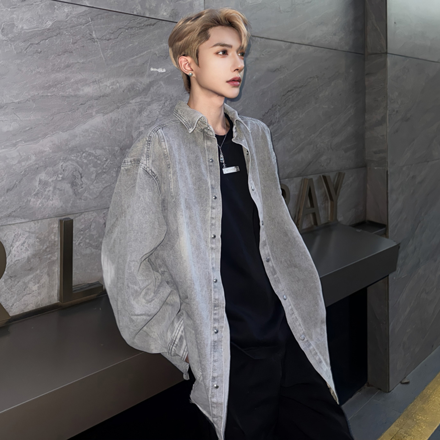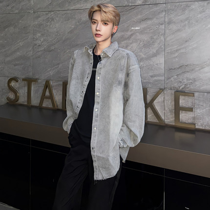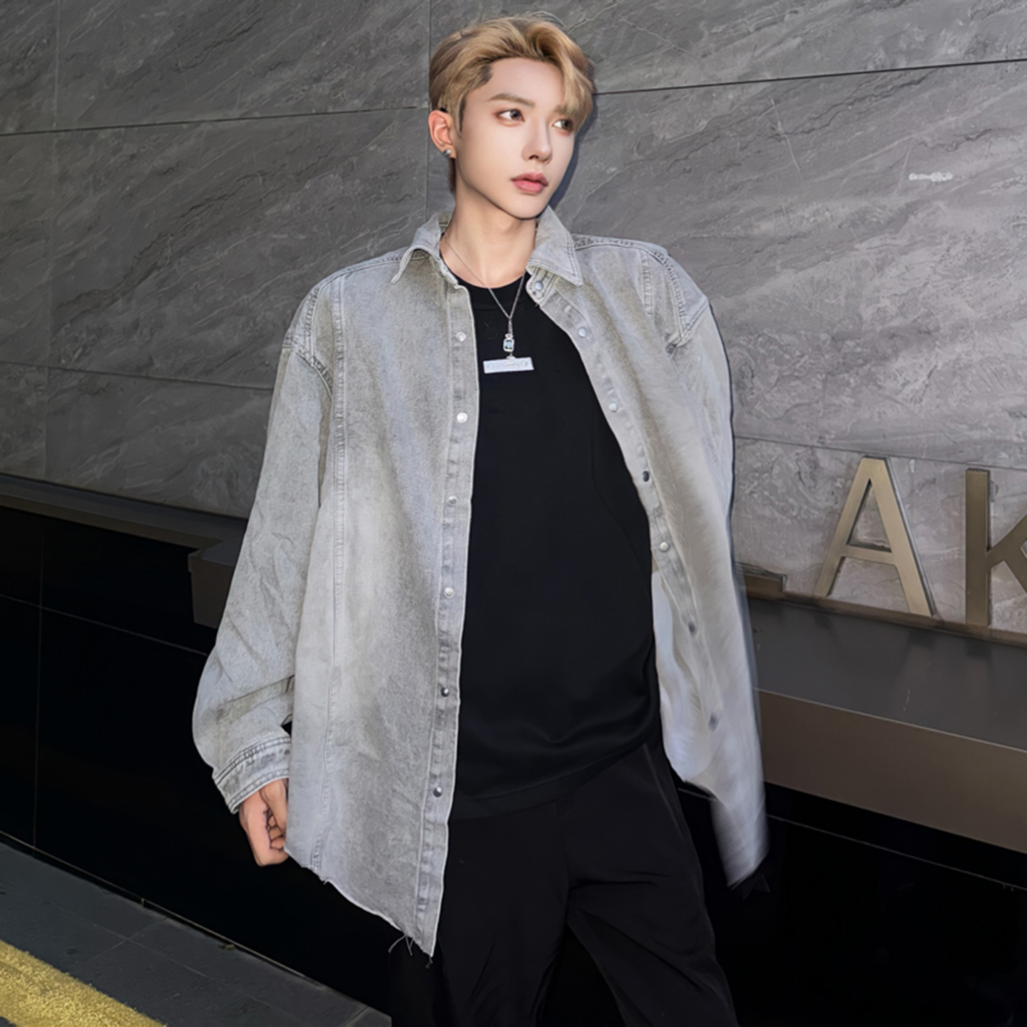 蓝灰色美式重工牛仔外套男款秋季ootd穿搭翻领牛仔衣做旧工装夹克