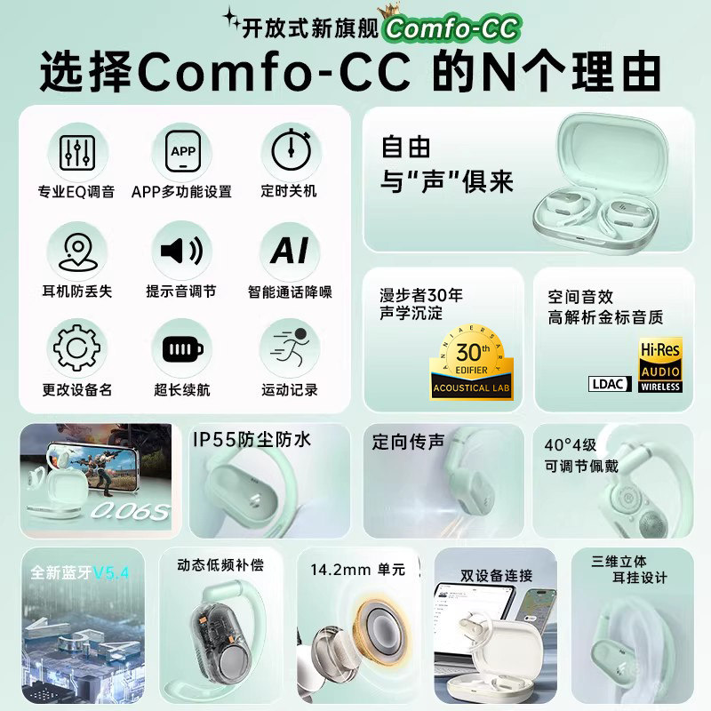 漫步者Comfo CC限定色薄荷绿挂耳式蓝牙耳机开放式不入耳无线运动