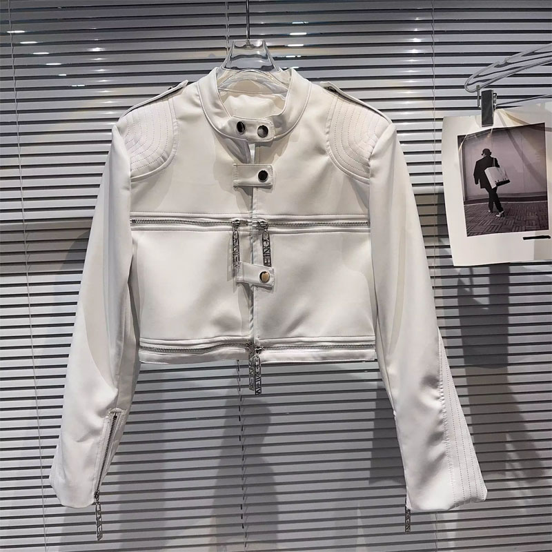 网红同款2025秋季新款辣妹横拉链立领肩垫PU皮短外套机车夹克皮衣