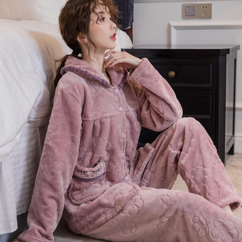 加肥加大码珊瑚绒睡衣女胖mm200斤加厚法兰绒家居服套装秋冬300斤