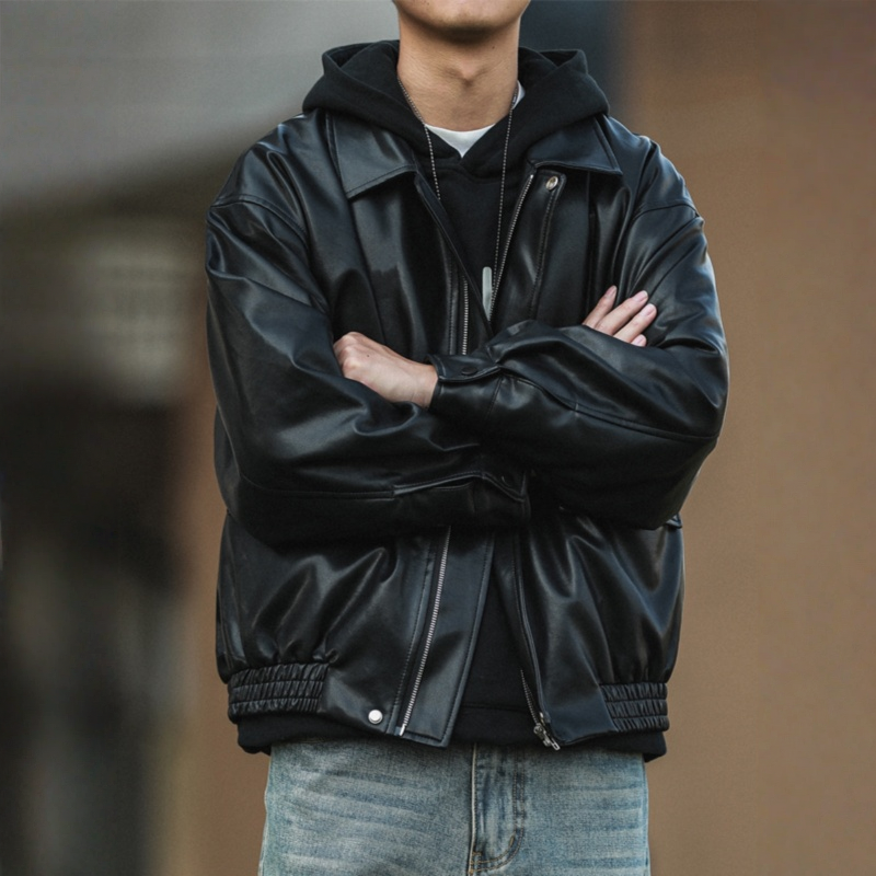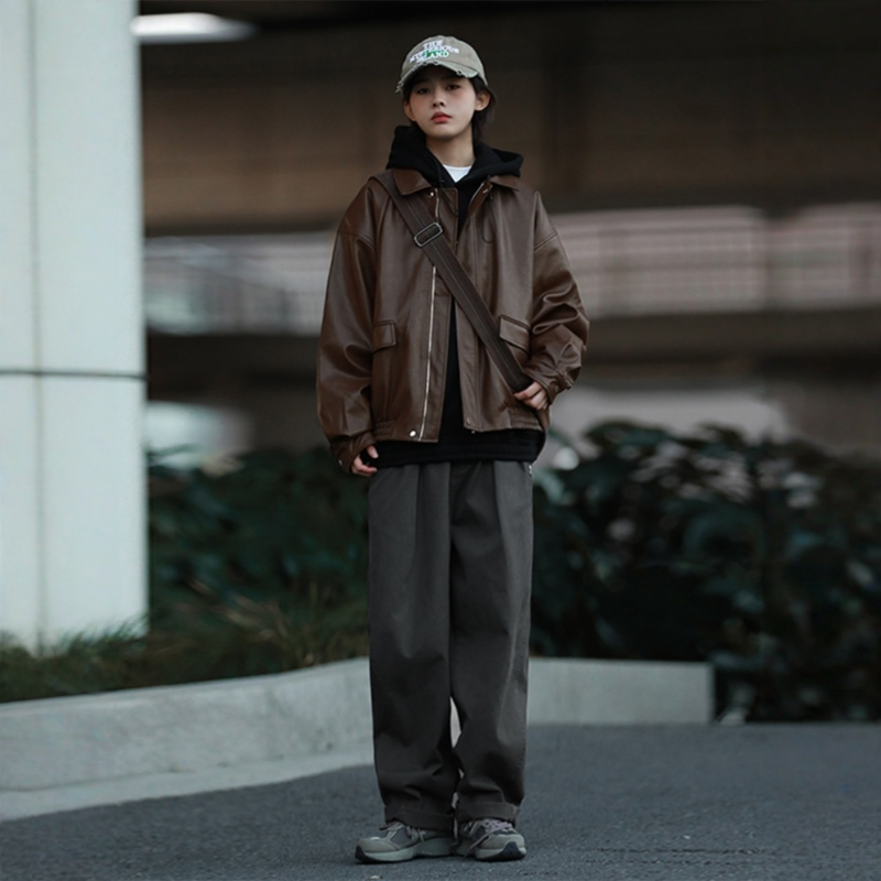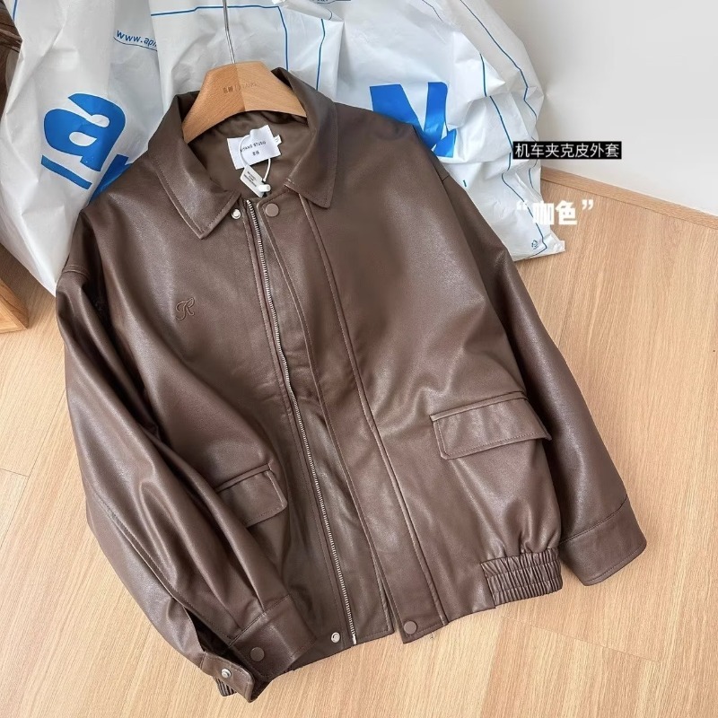 美式翻领皮衣短款外套复古春秋款男女休闲美拉德机车夹克棕色皮衣