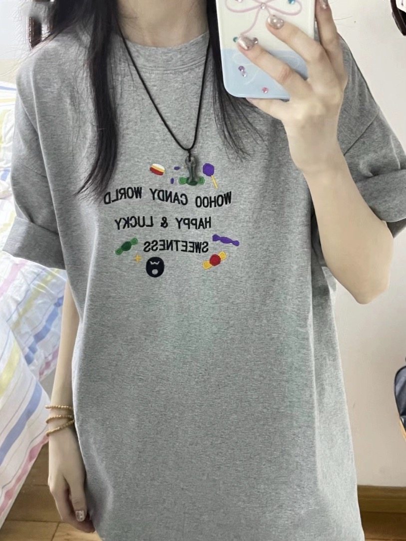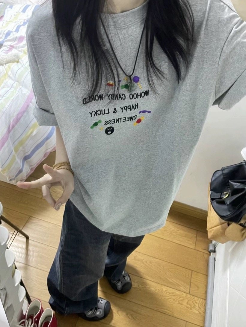 夏季灰色糖果色字母短袖t恤女