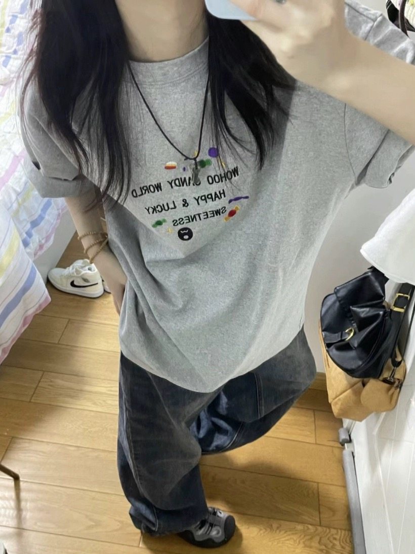 夏季灰色糖果色字母短袖t恤女2025新款正肩重磅纯棉复古美式上衣