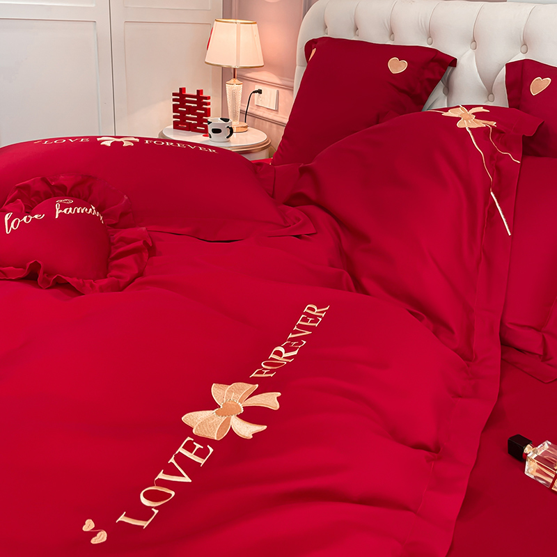 恒源祥大红色婚庆简约刺绣四件套婚礼陪嫁双人亲肤被套床单枕套