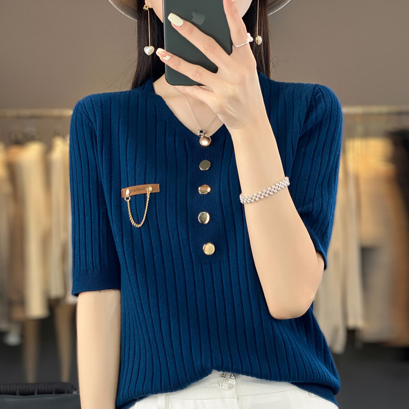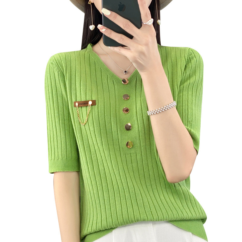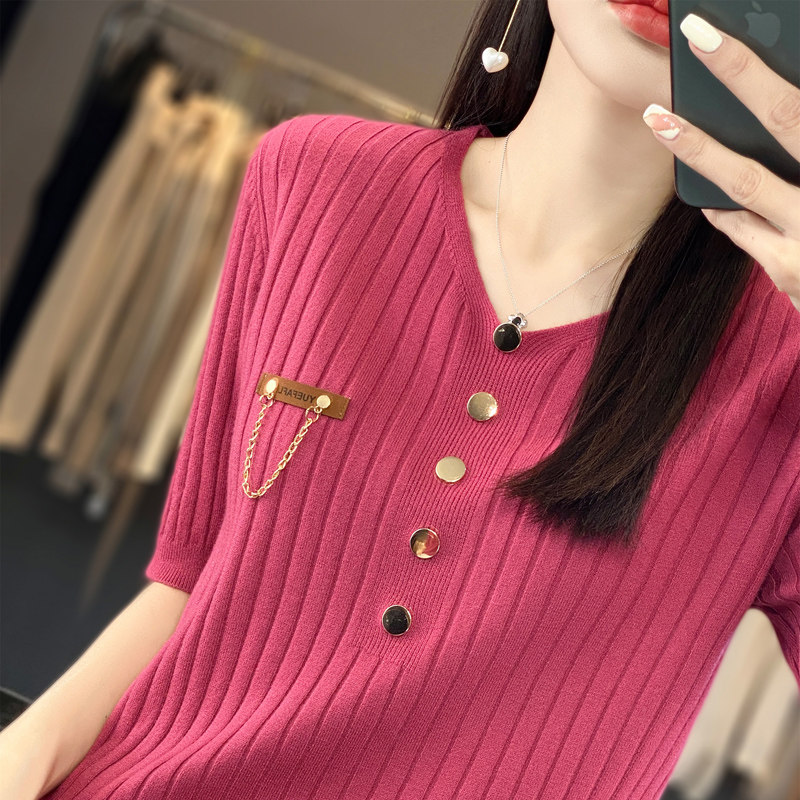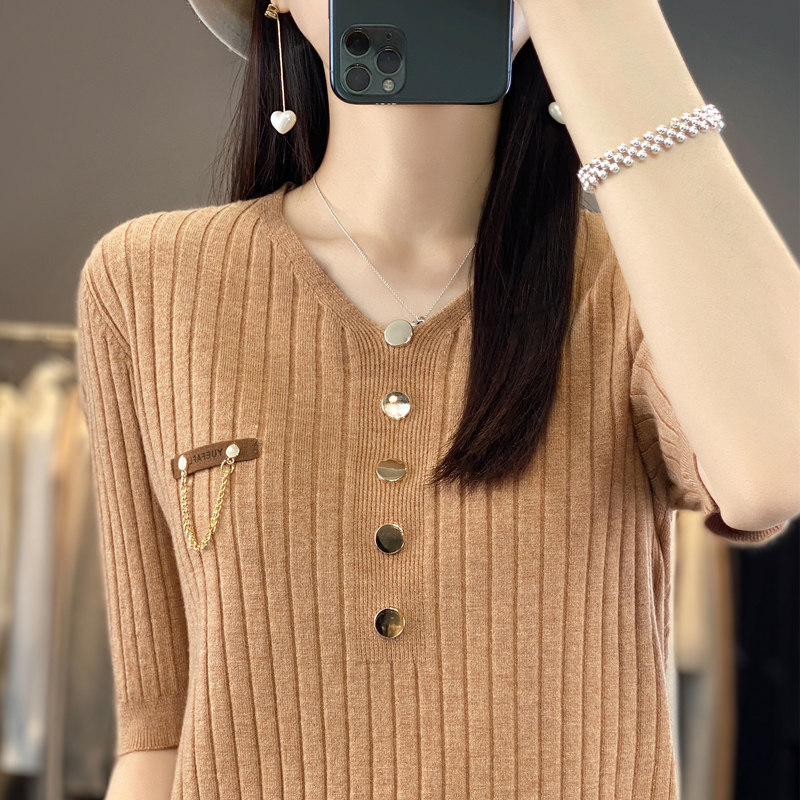 秋款新款V领五分袖针织短袖女休闲薄款打底衫百搭简约套头上衣