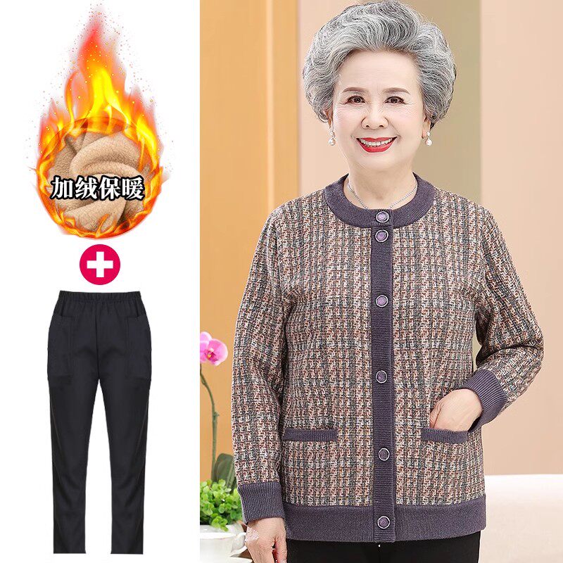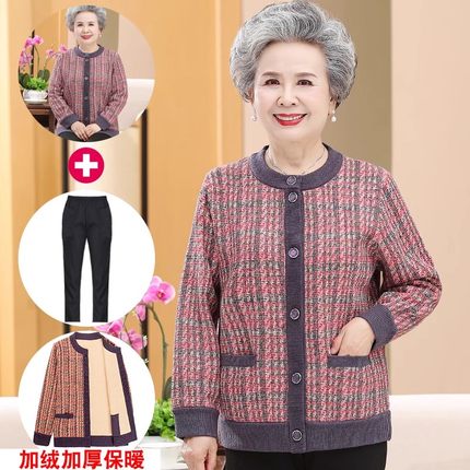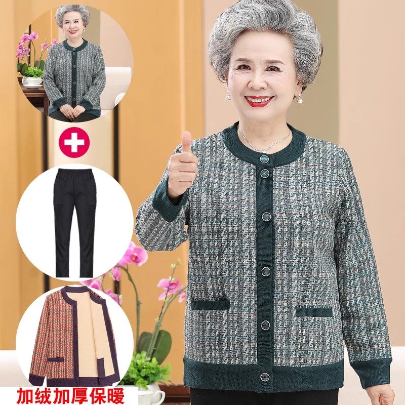 中老年人外套女秋冬装奶奶针织衫开衫老太太妈妈加绒毛衣宽松大码