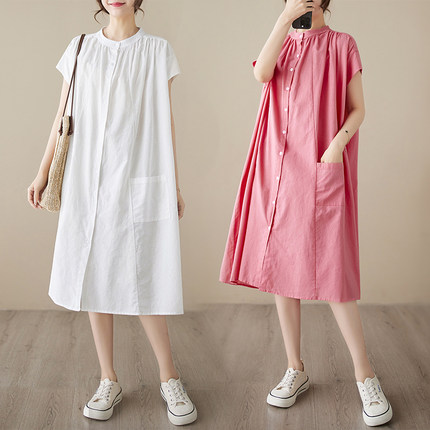 气质亚麻衬衫裙女夏季胖mm宽松显瘦设计感纯色褶皱立领短袖连衣裙