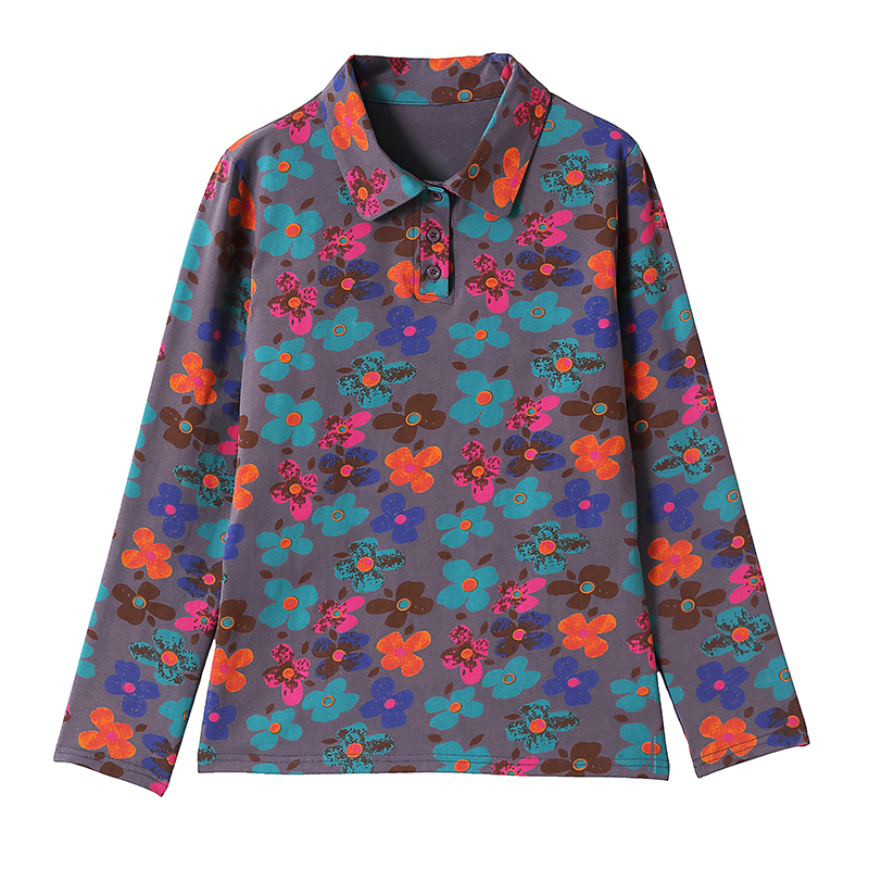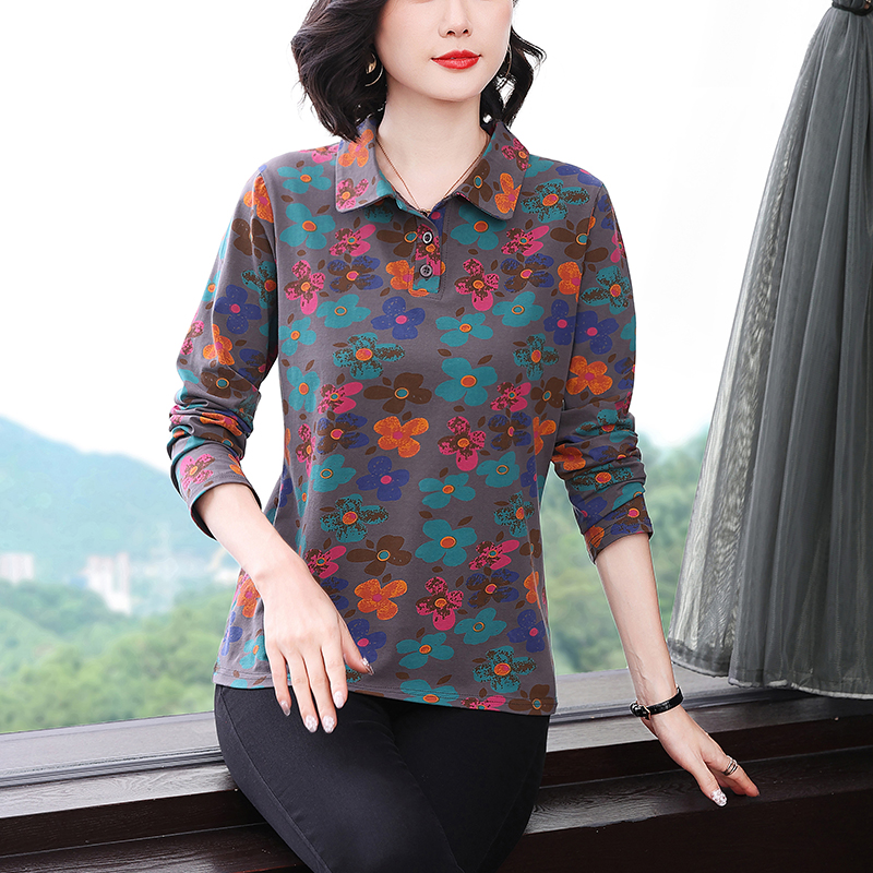 纯棉长袖t恤女翻领印花洋气衬衣春秋新款中年妈妈宽松减龄打底衫