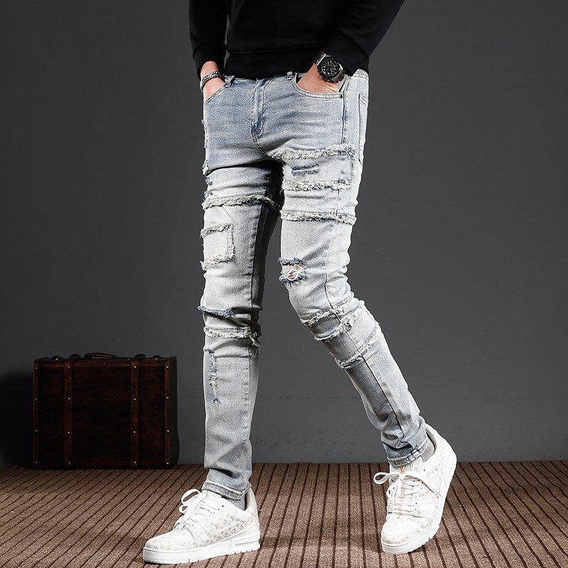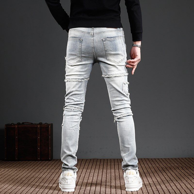 2025浅色牛仔裤男小众设计拼接破洞修身小脚潮流潮牌男装裤子