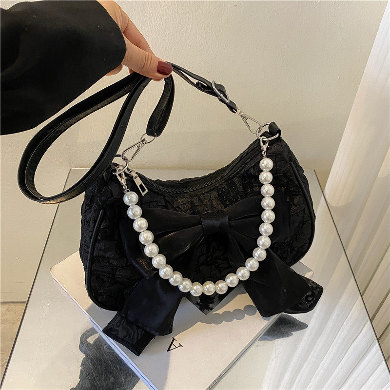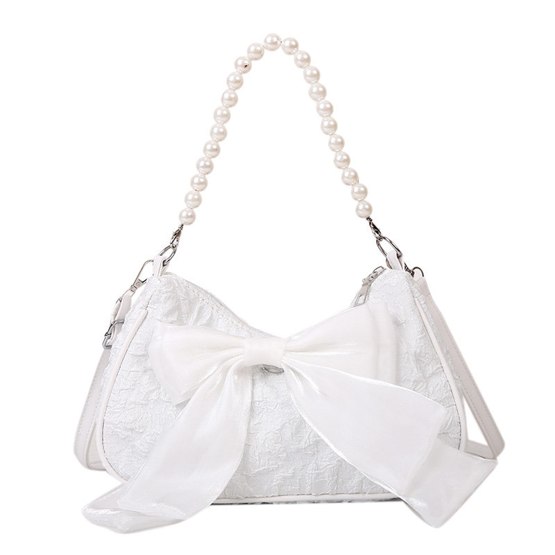 2022夏季潮流时尚珍珠蝴蝶结纯色腋下褶皱包单肩包个性链条斜挎包