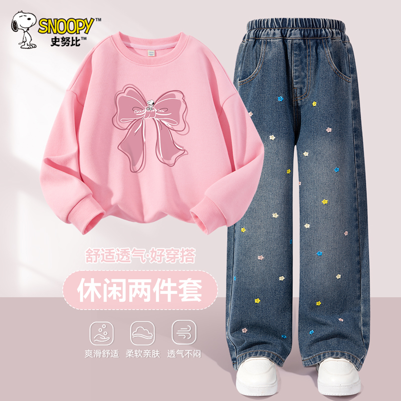 史努比女童套装2025新款女大童宽松阔腿牛仔裤春秋款儿童圆领卫衣
