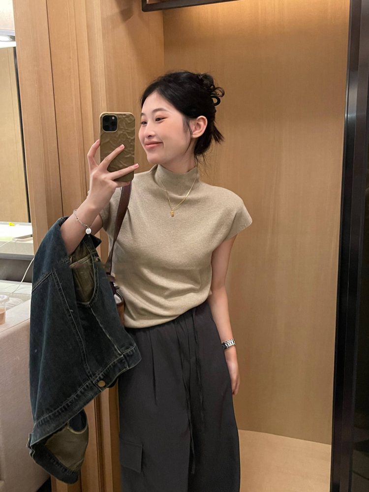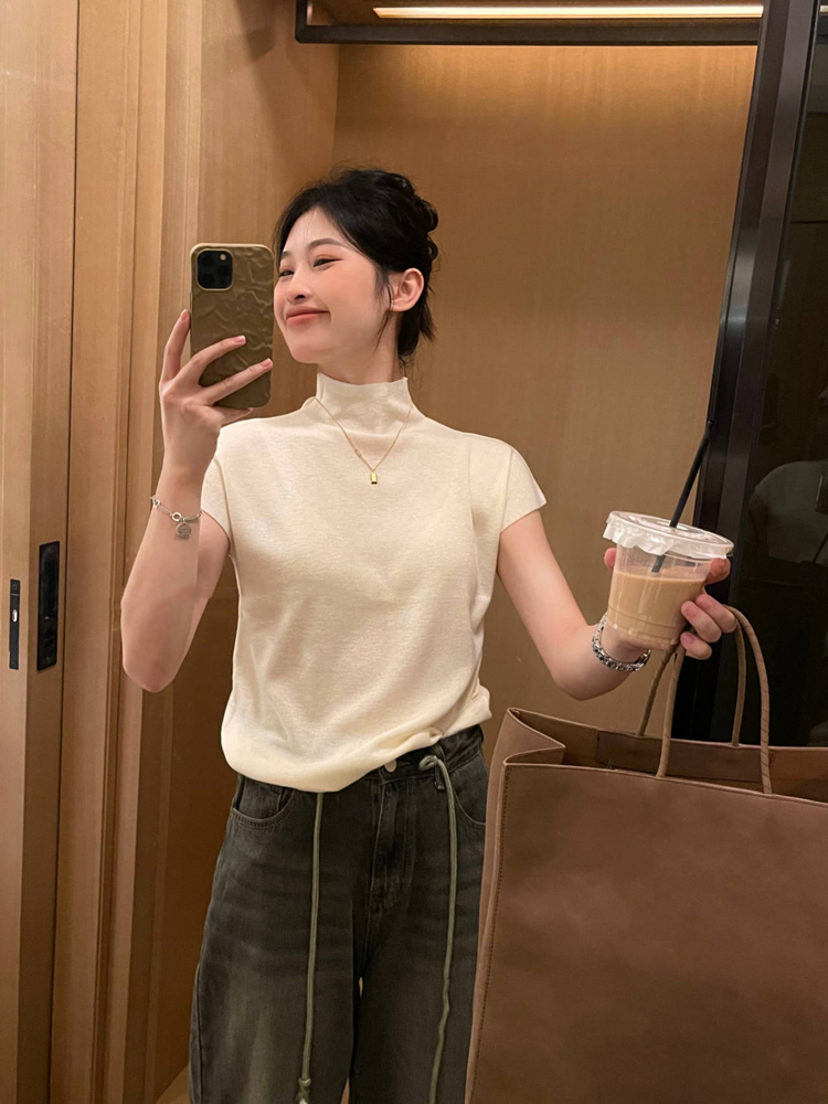 2024早秋季新款T恤女纯色高领针织衫宽松百搭套头短袖打底衫上衣