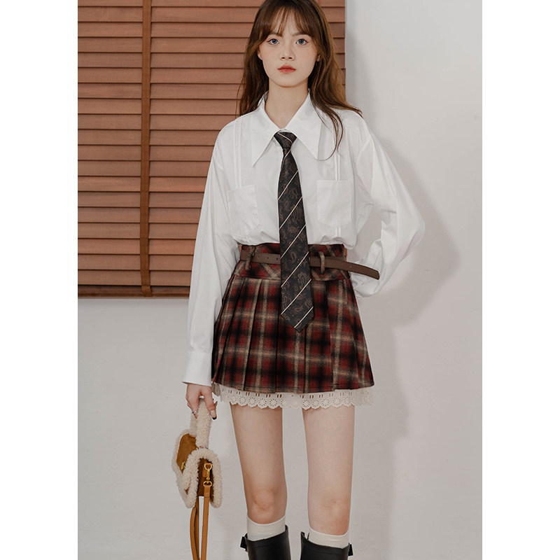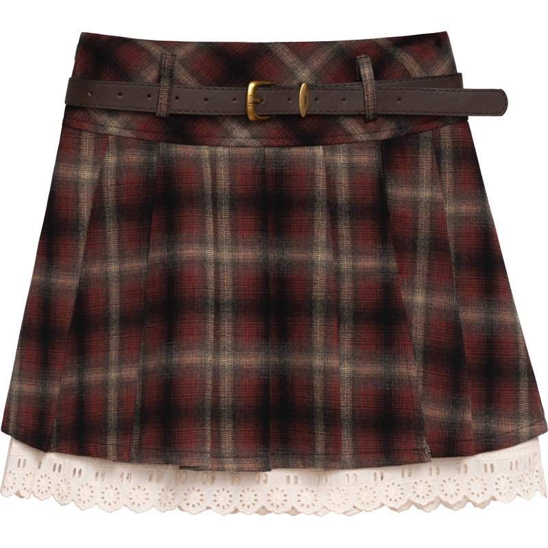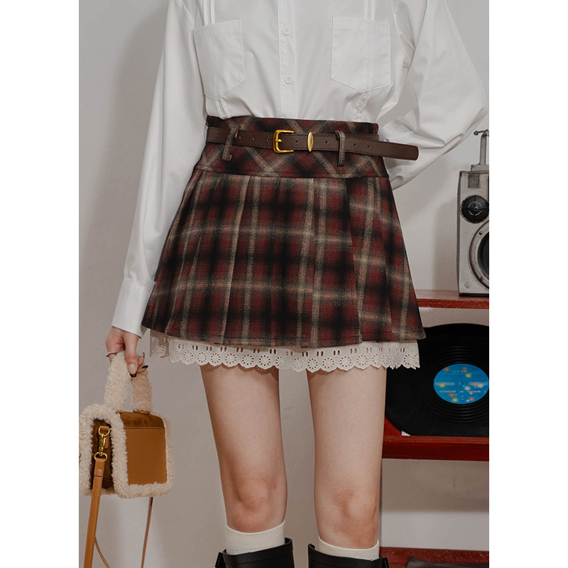 复古格子毛呢A字短裙女设计感开叉拼接蕾丝高腰防走光内衬半身裙