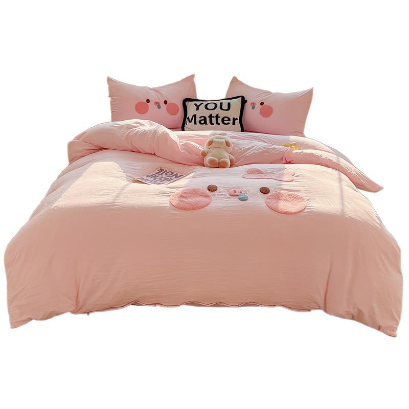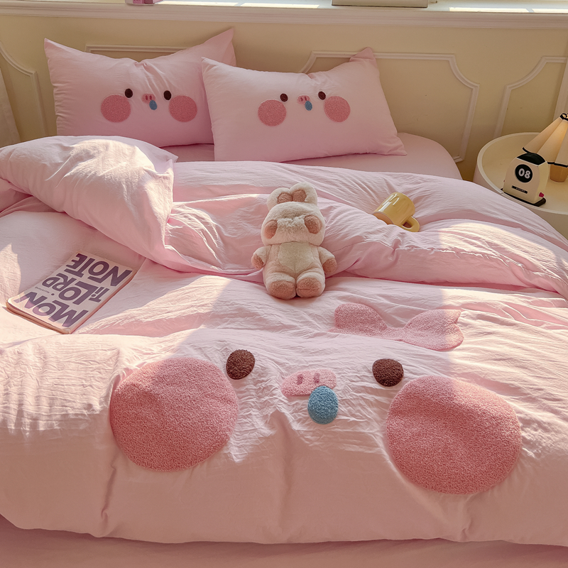 ins可爱小猪卡通毛巾绣四件套水洗棉被套床单学生宿舍床上三件套4