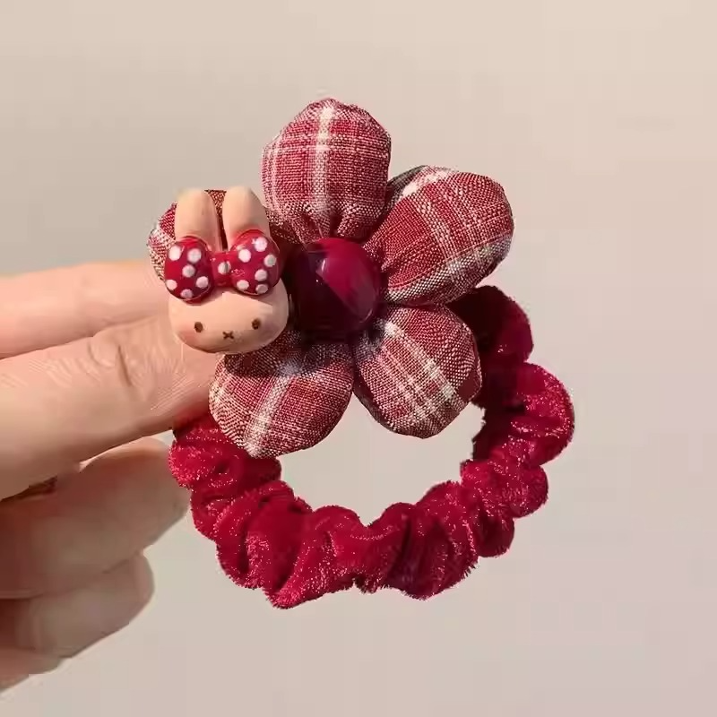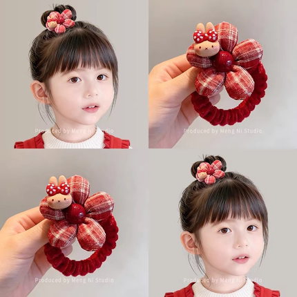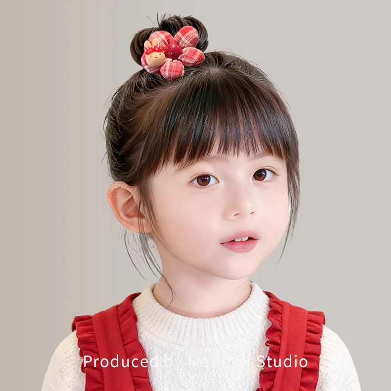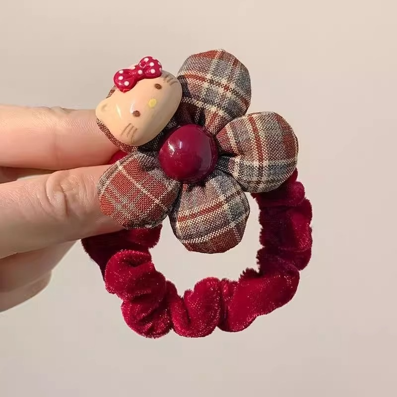 新年红色花朵头饰卡通KT猫儿童发圈女童秋冬植绒扎丸子头发绳发饰