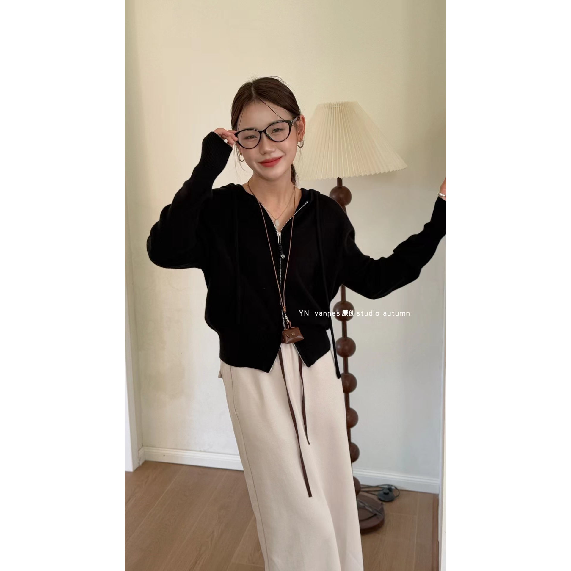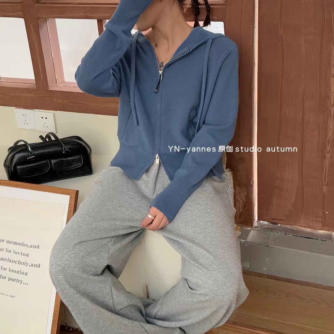 YN双拉链连帽长袖针织开衫外套女早秋2025新款设计感韩系毛衣上衣